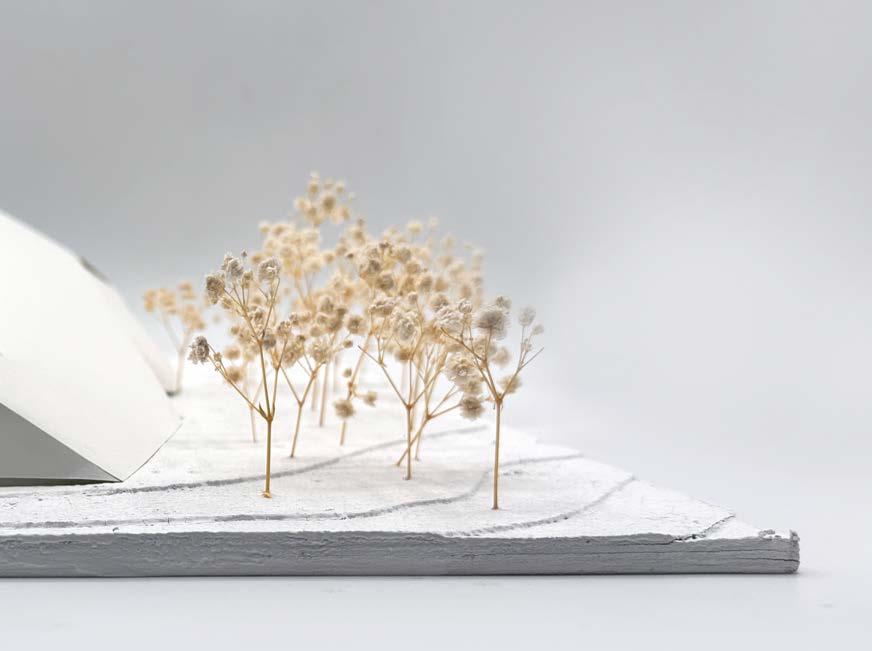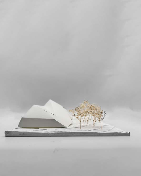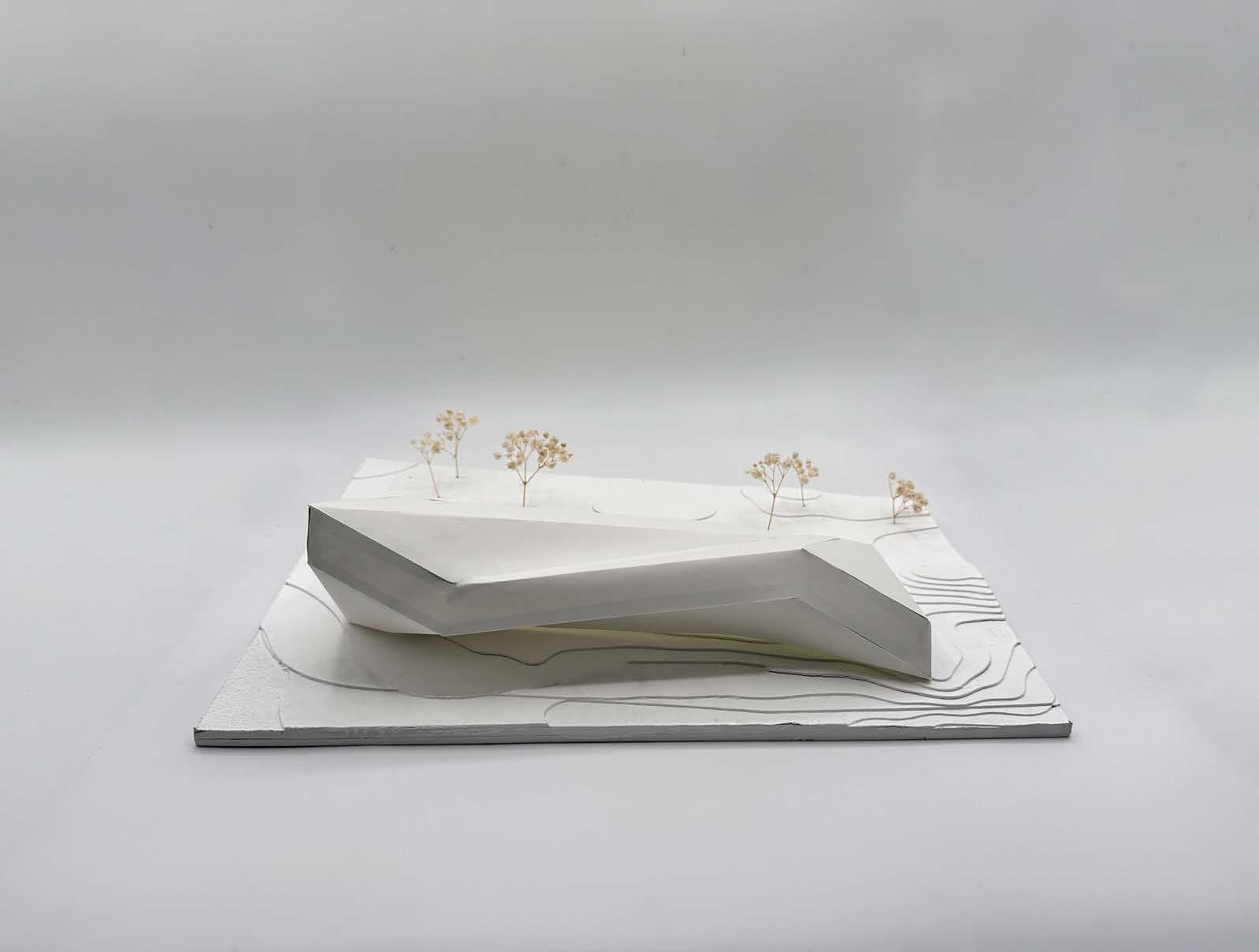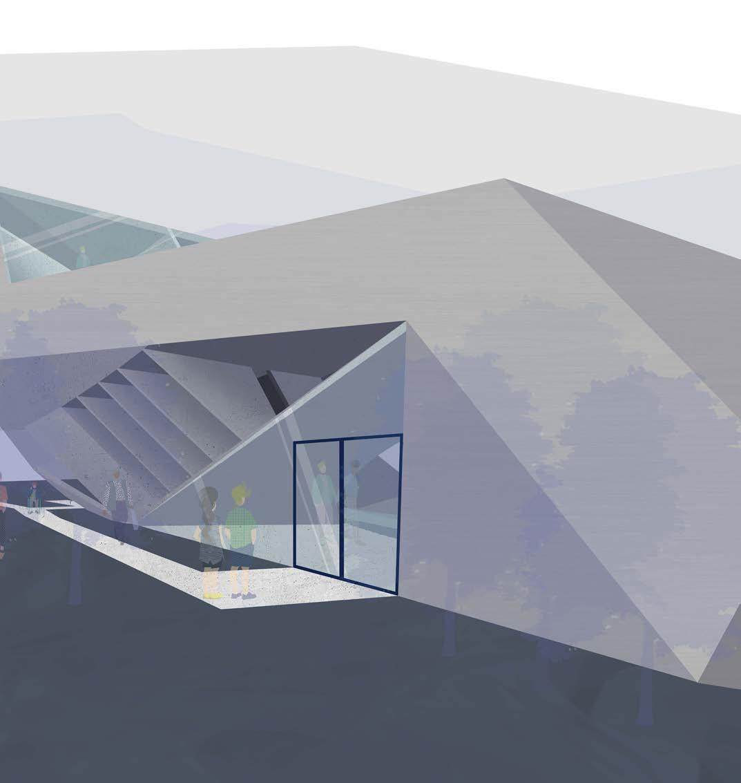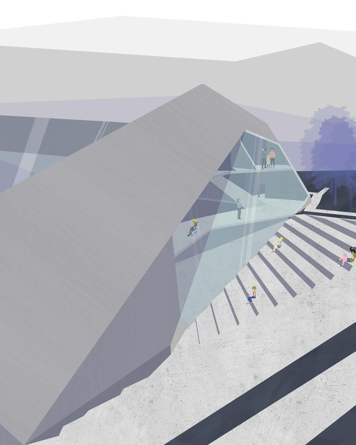 Rigid angles quickly became the defining language of this design, manifesting a site dominated by sharp geometries. An oversized representation of a parking lot helps to ground the site and add scale, underscoring the monumental quality of the building. Enhancing the museum-like character of the center, wherever form was removed, the facade was replaced with glazing, allowing for an almost excessive use of natural light that permeates the interior and creates an inviting atmosphere. In plan, the amphitheater extends geometric guidelines from the main building, further exaggerating the importance of form as it interacts with the site, creating a cohesive visual language that unites each element in purposeful alignment and draws visitors through the space in a structured yet dynamic flow, inviting exploration and engagement with the architecture.
