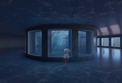 The last two volumes are exhibition spaces inspired by boat hulls, completely submerged and consisting of a double fiberglass shell with 1-meter ribs, allowing