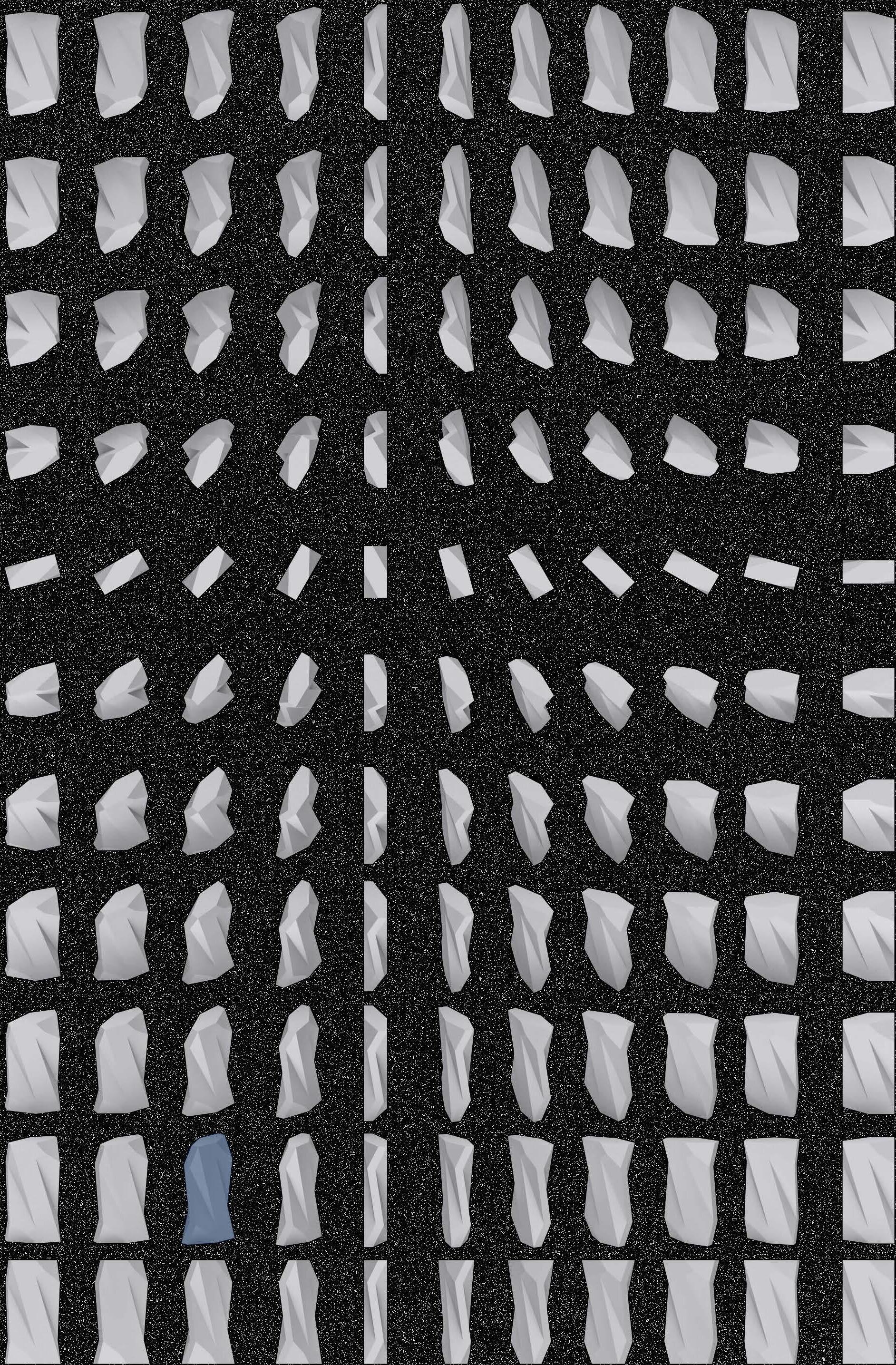 This array is an exploration of every rotation possible, in both the x and y direction, by 15°increments. After analysis, the selected massing had enough vertical height to create a functional covered area while being shallow enough and rotated correctly to create an amphitheater through boolean operations with the ground, resulting in a fractal site referencing Cayce’s historic quarries. CARVE