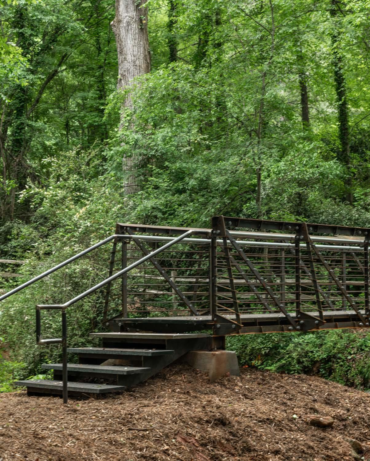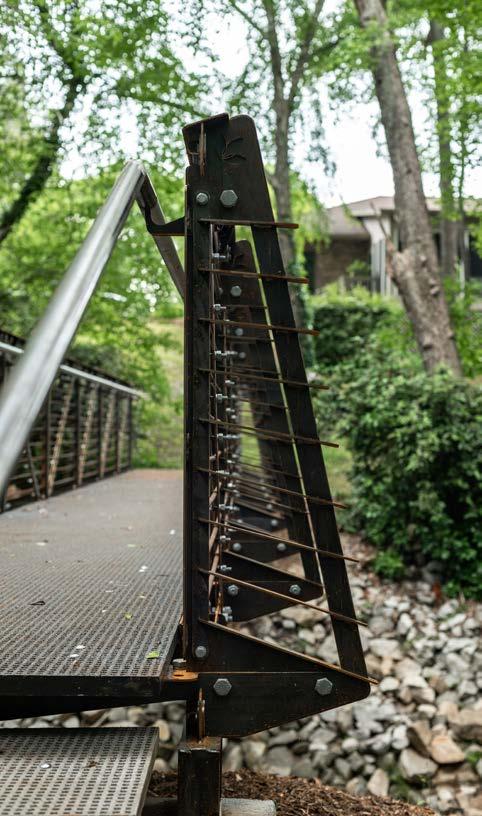 The site is located in a park between a senior living community—Clemson Downs, for whom the bridge was built—and a family-focused subdivision along a prominent walking trail frequented by children traveling to the local Elementary school. The design had to be built with consideration to all ages and a wide range of mobility access with suitable safety features.