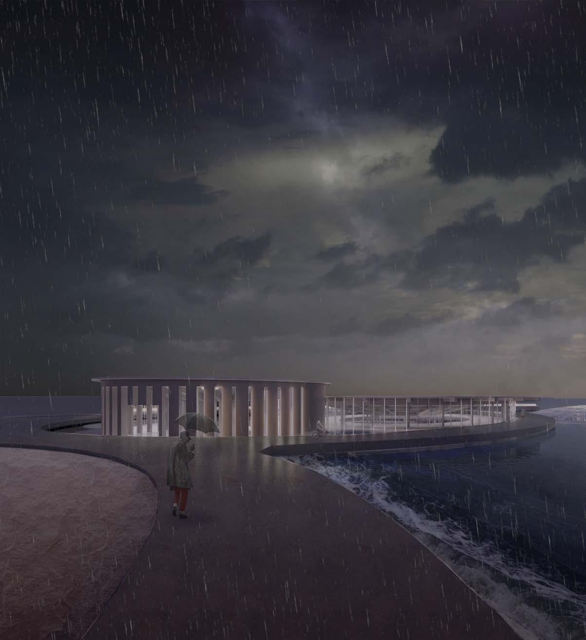 This project creates a continuous and uninterrupted circulation path along the shore that rewrites the relationship between man and water: we move instead of the sea, subverting the power balance of the sea’s destruction of the shore. The breakwater shape is a response to the currents of the Mediterranean, creating a stillwater pool that protects the center, allowing for the experience of submersing yourself into the sea through the cultural center.