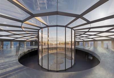 as the main circulation axis between the two spaces. The first of the two volumes features a column and beam structure with cantilevering beams on a radial column grid, encased by a glass curtain wall. The second is a dual system, comprising a main structure of columns and beams supporting shear walls, and secondary structures of a roof collar and buttresses. The massive glass