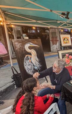 Sorsen’s painting that’s featured on the cover is more than a vivid coastal scene— it’s a meditation on movement, memory, and the quiet arc of a life. Against a backdrop of rich blues and purples, a single bird soars in front of a golden sun, its wings arched mid-flight. Though not considered traditional composition, Sorsen embraced the asymmetry, later recognizing the deeper symbolism that had emerged. “The bird, you know, it comes in, there’s a middle, and it leaves,” she reflected. “That kind of is what life is, you know.” Looking back on decades of creative evolution, she sees the work—like much of her art—not as something carefully constructed, but as something that moved through her. “I’m not planning to go anywhere, hopefully not any time soon,” she added with a smile. “But… the bird is going out the other direction,” she laughed.