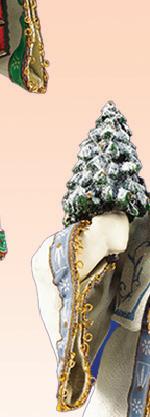 Handpainted, she stands an impressive 12 inches high and is designed with an innovative lighting feature: her transparent tulle gown shimmers with twinkling lights, while more light glows from her golden lantern. Her white coat is trimmed with faux fur, and she wears a golden belt and tassels. A red cardinal sits on her hand. Plays the melody: ‘Silent Night’.