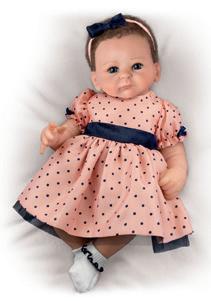 Every inch of this little one’s RealTouch® vinyl skin is baby soft and a cloth body underneath the vinyl allows for natural movement so that she is fully poseable. She arrives in a lace-trimmed cotton top adorned with a pink bow and her terry cloth nappy is decorated with a matching scallop design and trim. Her features are painted by hand to look truly lifelike and her babyfine hair and eyelashes will melt your heart.