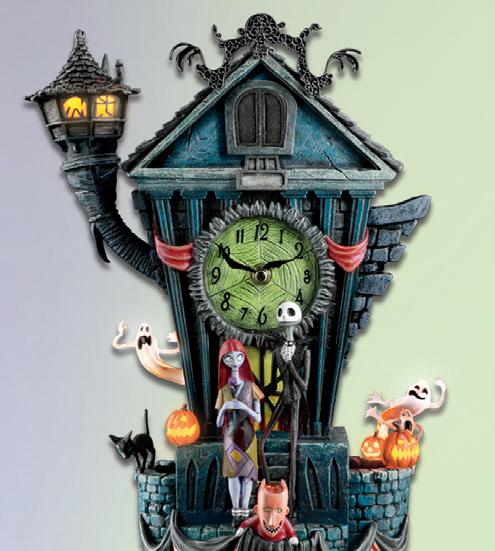 Jack Skellington and Sally stand in front of the Town Hall and Jack’s Tower. At the flick of a switch, the windows of Jack’s Tower, the ghosts and pumpkins illuminate with glowing light. Instead of a traditional cuckoo on the hour, this clock plays: ‘This is Halloween’ while Zero pops in and out of the doors atop the Town Hall. The swinging brass-toned pendulum is decorated with the Halloween Town Spiral Hill. Decorative pinecone weights hang below, with Shock and Barrel clinging to them while Lock cheers them on from above.