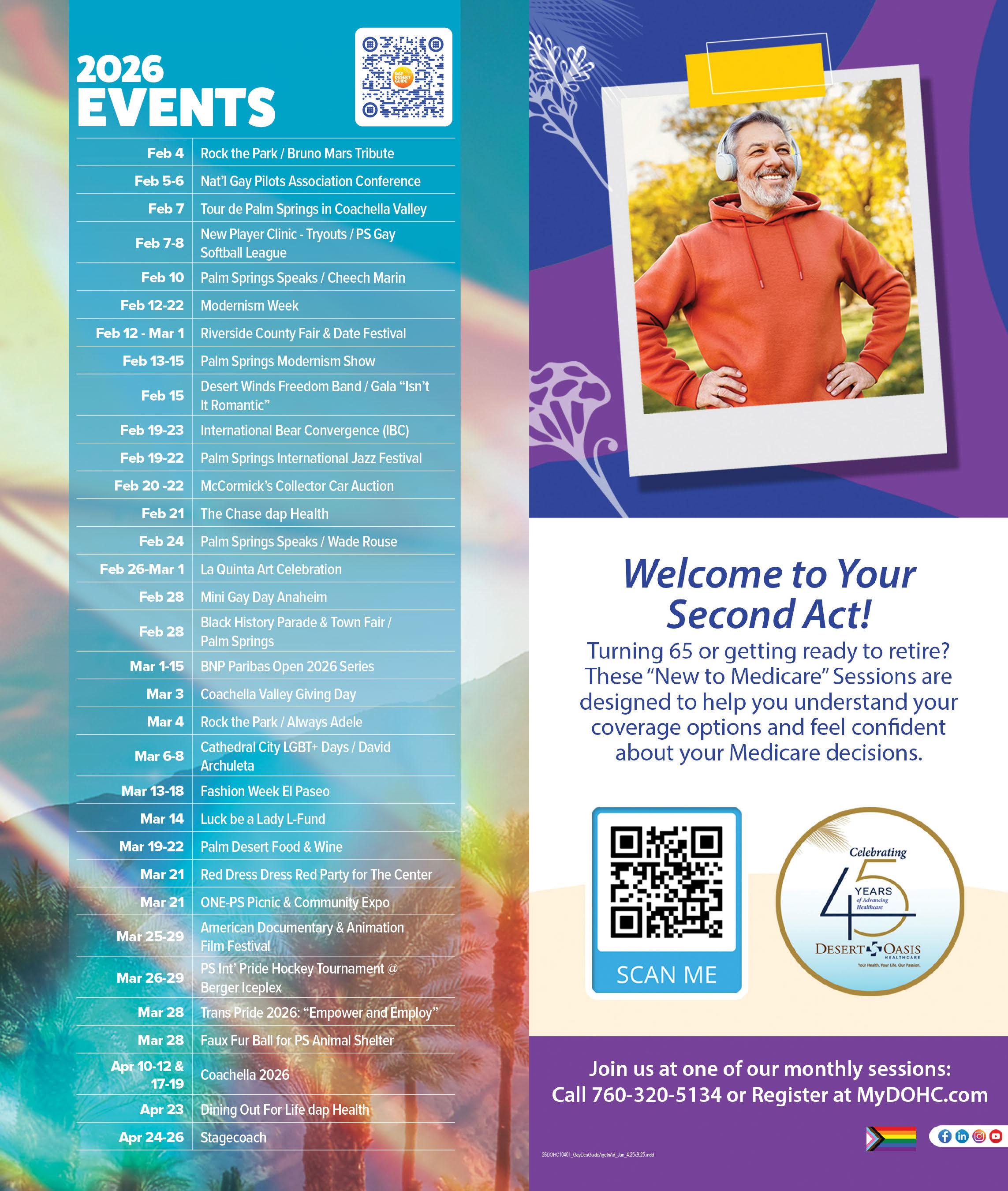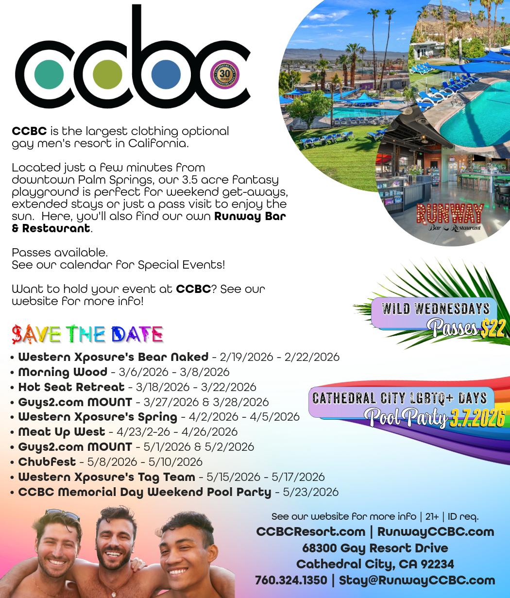 The 10th annual Cathedral City LGBT+ Days, held from March 6–8, promises to be bigger than ever with California's first pride of the year, a Pride Drone Show, and the signature Bed Race right in front of City Hall. On March 21, the LGBTQ Community Center of the Desert will host the Red Dress, Dress Red Party at the Palm Springs Air Museum, an event known for its high energy dance floor and multi award winning DJs. The International Bear Convergence returns to Palm Springs from February continued on page 7