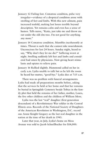 January 12 Failing fast. Comatose condition, pulse very irregular—evidence of a dropsical condition arose with swelling of feet and limbs. With this new ailment, pain increased tenfold, making last hours terrible beyond description. Yet remains calm and even has a sense of humor. Tells nurse, “Katie, just take me and throw me out under the old elm tree. I’m not good for anything any more.” January 14 Comatose condition. Mumbles incoherently at times. Throat is such that she cannot take nourishment. Unconscious for last 24 hours. Sunday night, heard to say, “Why don’t they let me die?” Suffering worst at night. Swelling suddenly left feet and limbs and considered bad omen by physicians. Now giving heart stimulants and opiates to relieve pain. January 16 Rallied slightly. Hammond called on her in early a.m. Lydia unable to talk but as he left the room he heard her mutter, “good-bye.” Lydia dies at 7:15 a.m. There was no problem with funeral arrangements. Lydia had made all preparations months before, asking that the services be held at her home and that her remains be buried in Springdale Cemetery beside Tobias in the family plot that held the remains of her father, mother, Laura, the five other children and the children of William Moss. Lydia was the last “real” daughter (first generation descendant) of a Revolutionary War soldier in the Central Illinois area. Records of the National Society of Daughters of the American Revolution in Washington, D.C. record one Annie Knight Gregory as the last real daughter in the nation at the time of her death in 1943. Later that year, in July, Lydia’s home on Moss Avenue was sold to Jacob Schnellbacher for $14,000. 87