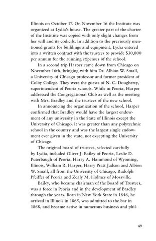 Illinois on October 17. On November 16 the Institute was organized at Lydia’s house. The greater part of the charter of the Institute was copied with only slight changes from her will and its codicils. In addition to the previously mentioned grants for buildings and equipment, Lydia entered into a written contract with the trustees to provide $30,000 per annum for the running expenses of the school. In a second trip Harper came down from Chicago on November 16th, bringing with him Dr. Albion W. Small, a University of Chicago professor and former president of Colby College. They were the guests of N. C. Dougherty, superintendent of Peoria schools. While in Peoria, Harper addressed the Congregational Club as well as the meeting with Mrs. Bradley and the trustees of the new school. In announcing the organization of the school, Harper confirmed that Bradley would have the largest endowment of any university in the State of Illinois except the University of Chicago. It was greater than any polytechnic school in the country and was the largest single endowment ever given in the state, not excepting the University of Chicago. The original board of trustees, selected carefully by Lydia, included Oliver J. Bailey of Peoria, Leslie D. Puterbaugh of Peoria, Harry A. Hammond of Wyoming, Illinois, William R. Harper, Harry Pratt Judson and Albion W. Small, all from the University of Chicago, Rudolph Pfeiffer of Peoria and Zealy M. Holmes of Mossville. Bailey, who became chairman of the Board of Trustees, was a force in Peoria and in the development of Bradley through the years. Born in New York State in 1846, he arrived in Illinois in 1865, was admitted to the bar in 1868, and became active in numerous business and phil-