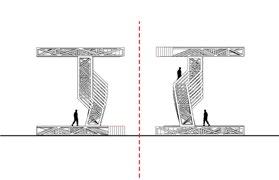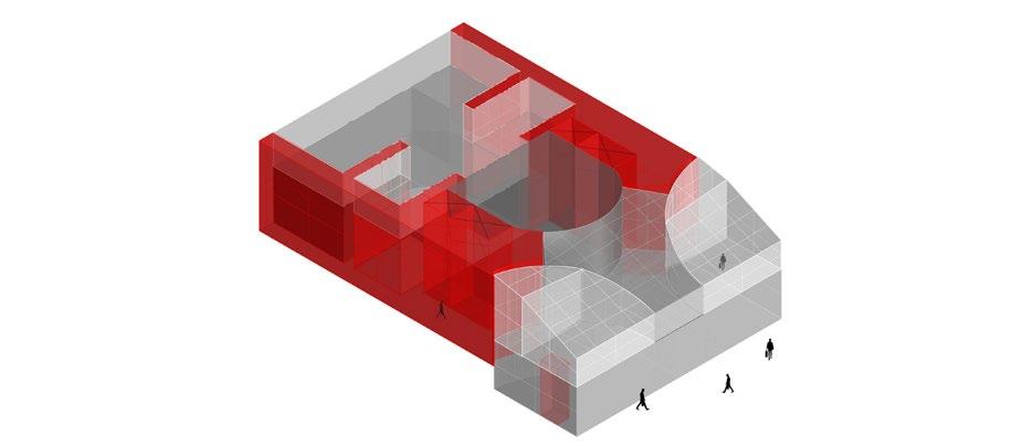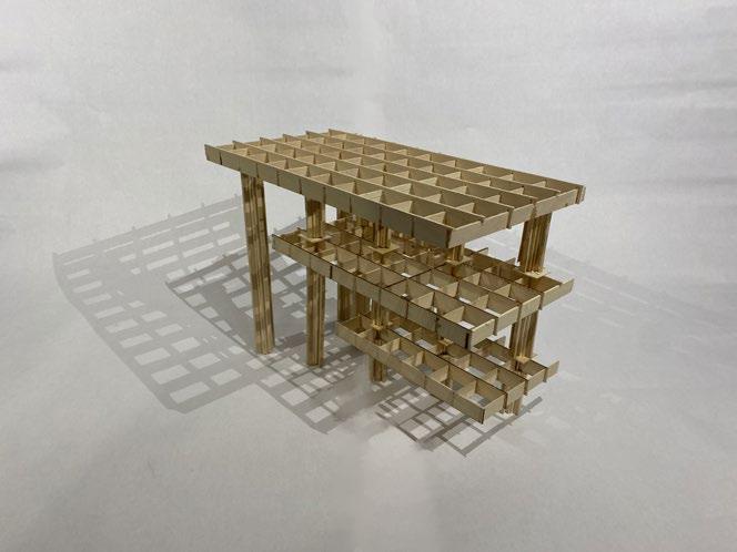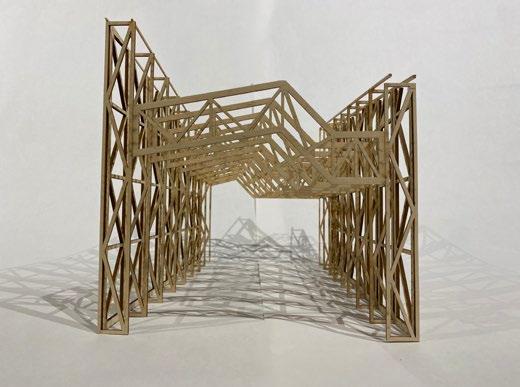 Truss Concept Brad Robinson As previously mentioned, a noteworthy aspect of this structure lies in its adaptability and versatility for various applications, all leading to common end goal. Illustrated in the second set of elevations, when the truss is reoriented orizontally it assumes a role more akin to space frame. This configuration gives rise to pathways, serving as compressive and releasing structure. The potential spatial opportunities stemming from such a conceptual model become apparent, offering room for visualization and further development. The exploded axons also depict how the supporting legs of the trusses are effectively executing their functions. In both iterations, he terraced arrangement of the legs aligns with the directional structure concept, solidifying the entire model as a substantial directional structure, regardless of its specific arrangement. In its initial conceptual phase, my focus was on developing a structural ceiling configuration that could influence the directional flow of people within given space. The introduction of a simple truss shape helped establish clear distinction between areas where circulation might be more dynamic, directing individuals toward a specific destination, and spaces designed for a more relaxed and unrestricted movement. As the design progressed, the exploration expanded to incorporate an influential ceiling condition while simultaneously crafting mirrored second-story configuration. As illustrated in the set of elevations at the top of the page, the truss design facilitates a mirrored occurrence on both the first and second floors of the design, ensuring a cohesive and balanced architectural expression. Spatial direction within a structure can influence how occupants navigate and experience a space. Thoughtful design can guide people through a building in logical and intuitive manner, enhancing their overall experience. The goal of this truss concept model was really geared toward creating a structure that can aid in spatial direction, not solely in just one plane or area, but in multiple different ways no matter the structural circumstance. How can one design a sort of universal structure? Th Post & Beam Concept Brad Robinson The arrangement of columns to shape the spatial layout is influenced by various factors. One notable precedent explored during this project phase was Mies Van der Rohe’s Neue Nationalgalerie. In this project, Mies employed a meticulously articulated column design, accentuated by substantial roof structure. Opting to position the columns closer to the center and forsaking the building corners to create cantilever effect, Mies achieved distinctive architectural presence. Inspired by this approach, aimed to emphasize my columns similarly As illustrated in the floor plan, the columns are organized in the configuration reminiscent of a “Turnout” railroad intersection, strategically offset from the corners in structured grid pattern for heightened visibility This deliberate arrangement produces visually striking floating edge, guiding the observer’s gaze toward the pivotal columns. Furthermore, the waffle slabs in my design emulate Mies’s roof condition in the museum, extending across the entirety of my structural concept model. This layering technique ensures that spaces consistently allude to the contextually designed columns, creating a cohesive and impactful architectural experience. The inception of this conceptual model took root during an exploration into the works of the renowned Japanese architect, Kengo Kuma. Renowned for his innovative and distinctive approach to architectural design, Kuma’ style is marked by a seamless integration of elements that hold contextual significance to their respective sites. Following this inspiration, my research extended to the city of Gulfport, where sought to uncover the deeper meanings embedded in design. In my early investigations, my focus expanded beyond merely identifying contextual significance; also looked into uncovering ways in which steel tectonics could be derived and integrated into the conceptual framework. From this, two things of Gulfports history that stood out to me was the railroad and trolley system. These two things played significant roles into how Gulfport was originall founded, its great success with Boomtown, and past memories that still resurface today. My approach to incorporating this concept into my Post & Beam design was inspired by the railway track. Drawing a parallel between the tracks and w-flange column, with slight alterations in the flange where the train wheels traverse envisioned integrating a square column enveloped on all four sides by a steel structure mimicking the profile of railroad track. This visual motif commences at the base of the column and extends seamlessly to the waffle slab above, forming a cohesive and visually engaging crossroads/intersecting connection. Steel columns that wrap the center column inspired by the sectional shape of a train track Concrete column base inspired by the conical shape of a train wheel Layer 3 Layer 2 Layer 1 Floor Plan ++ + +++ ++++ 11 02 Post & Beam Concept Design 1 Post & Beam Concept Design 2