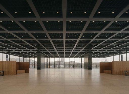 The formal strategy of the Neue Nationalgalerie is characterized by a harmonious blend of modernist principles, a careful balance of transparency and solidity, and an emphasis on simplicity and order. Mies uses a prominent column grid on both the interior and exterior of the building as a way to separate and order space throughout the entire project. Each of its eight columns are evenly spaced and support the large, steel waffle roof, contributing to the overall sense of order and regularity in the design. The interior of the museum is characterized by an open floor plan, allowing for flexible exhibition spaces. The absence of interior supporting walls provides a sense of continuity and adaptability in how artworks are displayed.