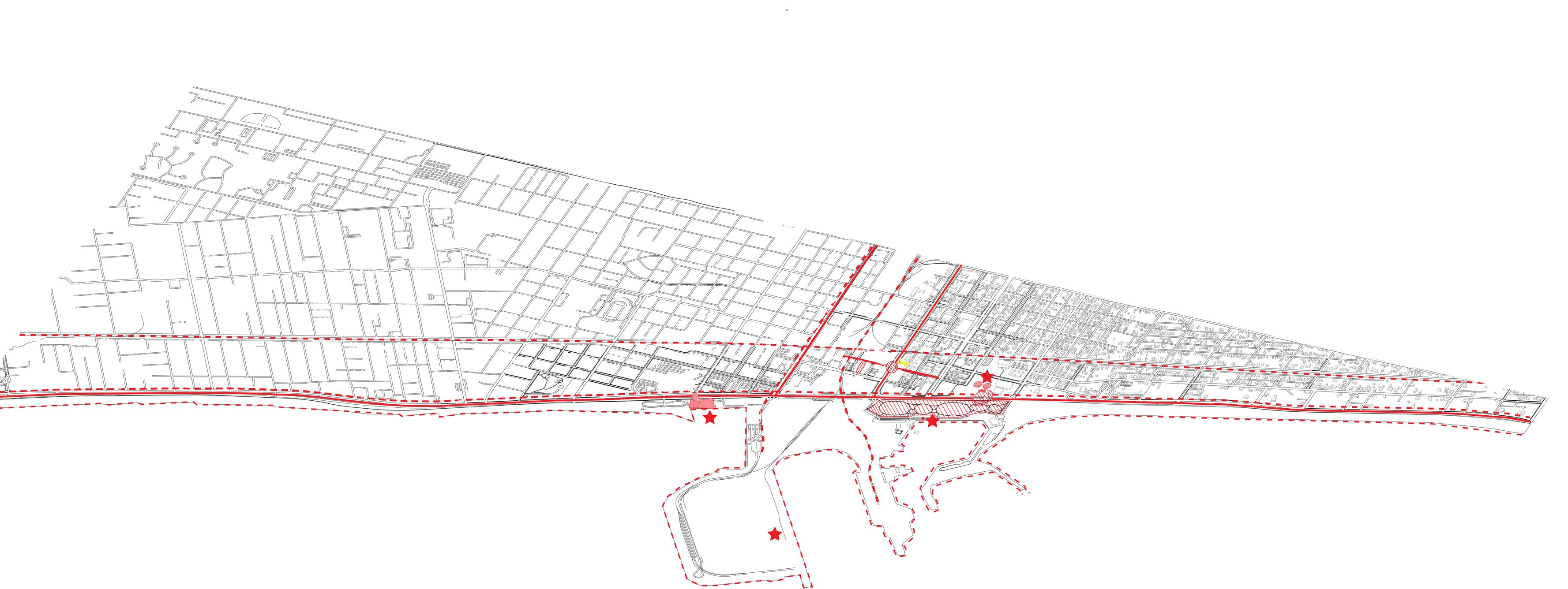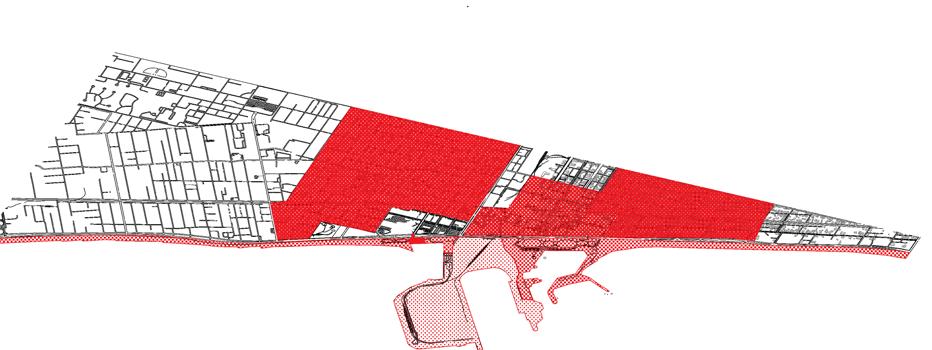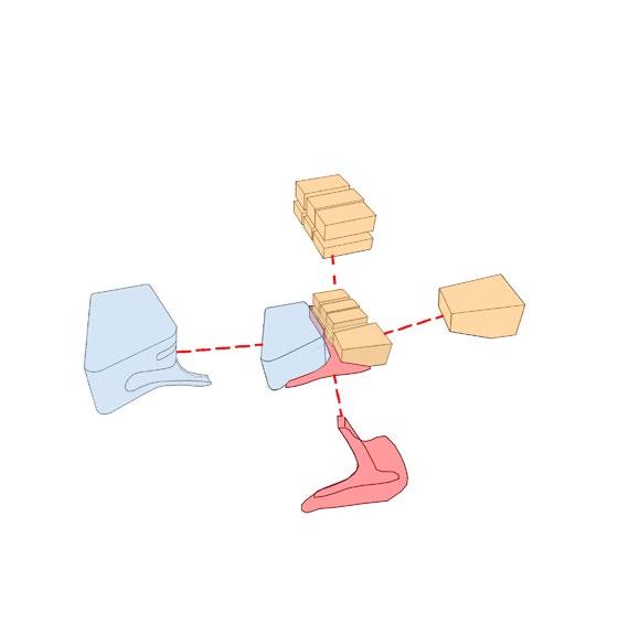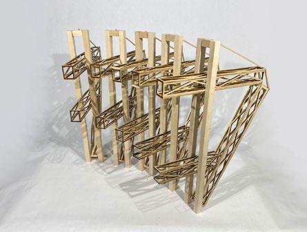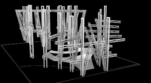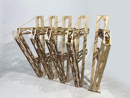 During our site visit in Gulfport, it’s impossible to overlook the imposing construction cranes situated near the water. These cranes have organically evolved into a distinctive landmark for Gulfport, whether intentionally or not. While inherently rigid in their structural function, their potential for spatial innovation within a defined boundary is undeniable. In m design concept, I made a deliberate choice to re purpose these crane structures, using them to shape space. In addition to the conventional single-armed crane configuration, I incorporated an extra arm, referred to as the “Rear Jib,” in a sys tematic and gradual development. This sequential evolution across each individual crane not only generates captivating spaces on their front side but also contributes to the creation of intriguing and functional spaces on the backside of the structure.