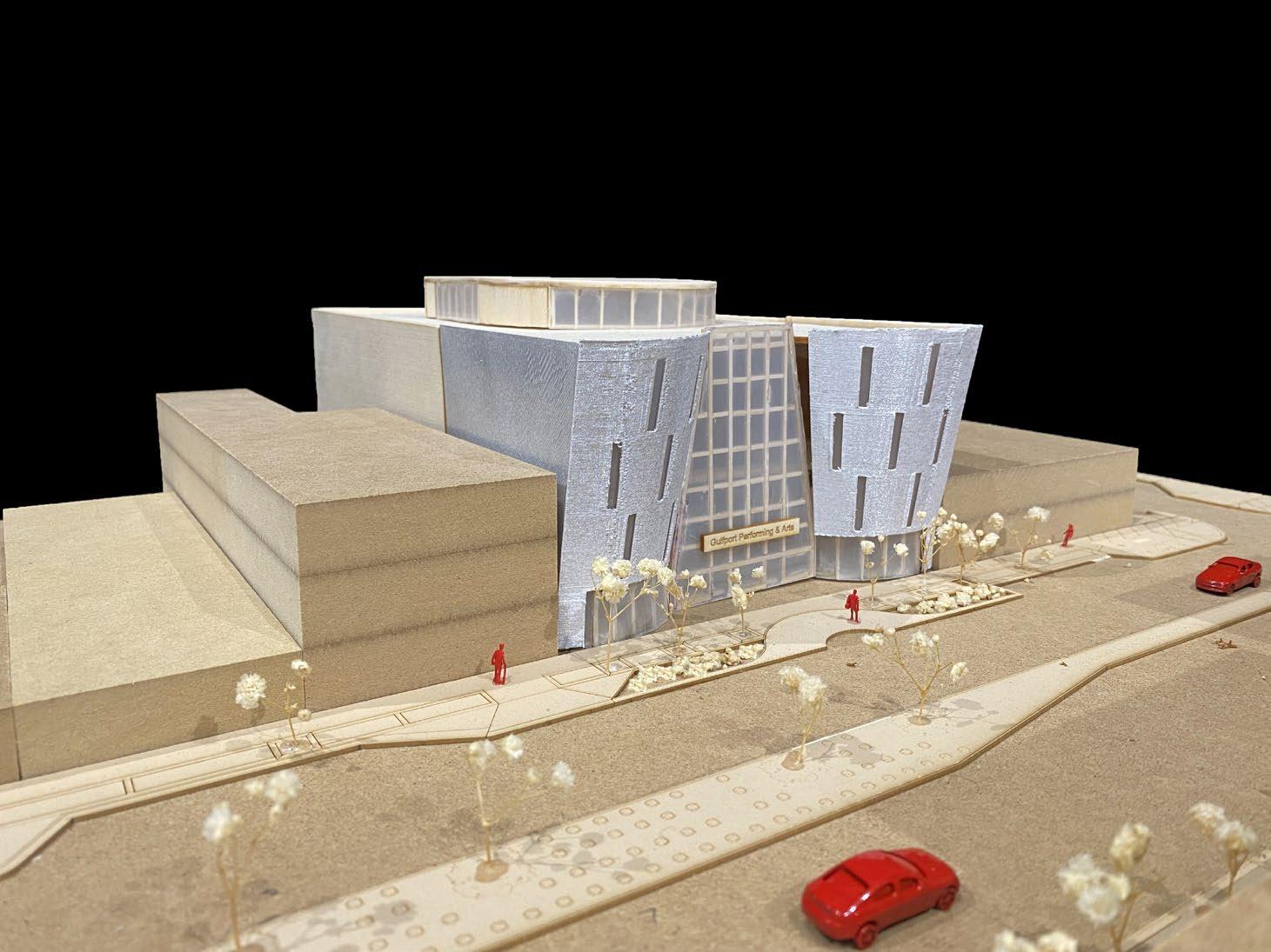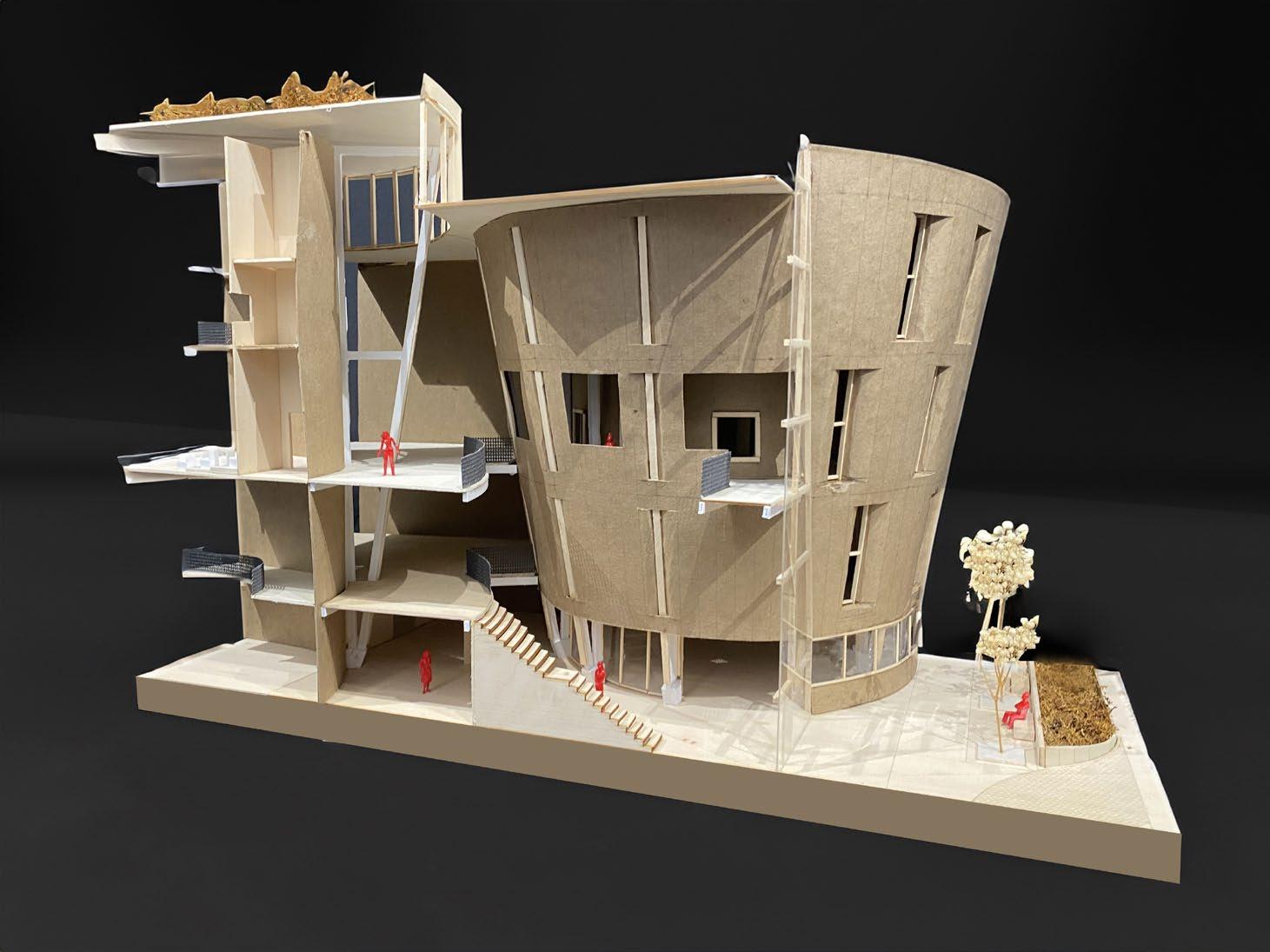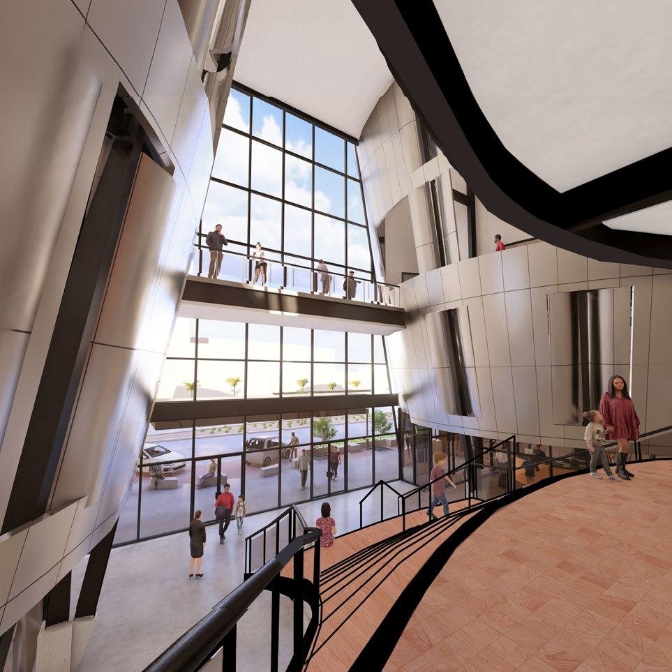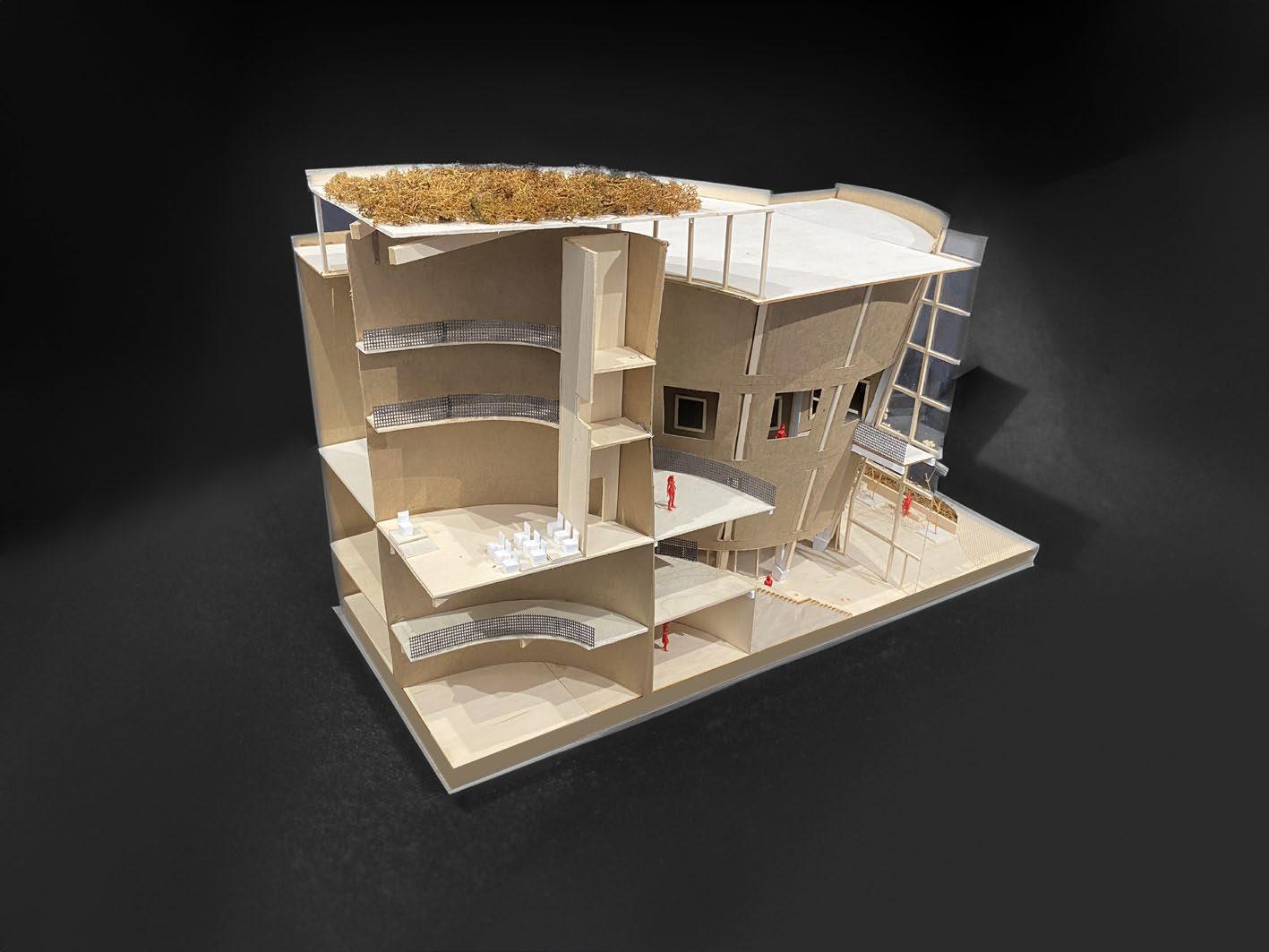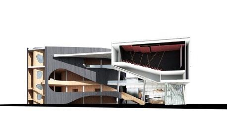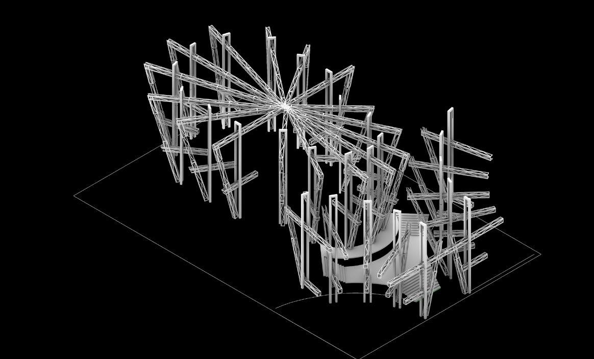 The structure serves the dual purpose of efficiently bearing loads on the front side, while harnessing its expressive qualities on the backside to craft an inviting and aesthetically pleasing space. As shown on the right, one can visually begin to conceptually see theater spaces start to form on top of each other, and then also possible grand lobby spaces.