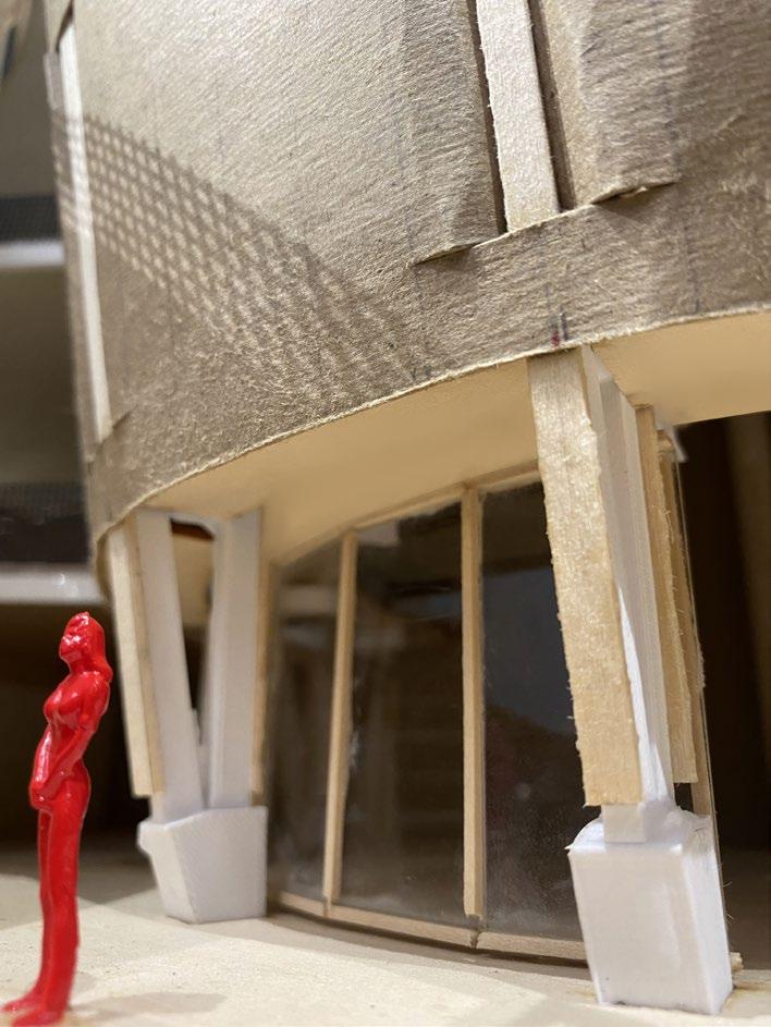 When delving further into the details of my design, I made the decision to detail a curved recess window on the exterior facade that transforms into a curved column wrap on the interior. The idea behind this decision was initially fueled by the curvature nature of my building in plan and elevation, but also from the idea of highlighting the overall structure of the building.