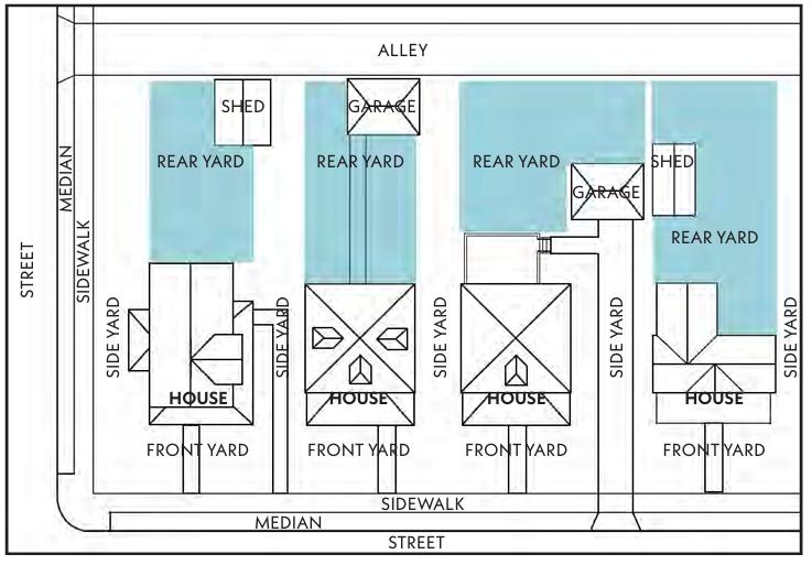 Figure 5.46 - The diagram above shows example locations (marked in blue) that would be appropriate to place a new accessory structure. All plans must be reviewed prior to project initiation. (2022). Graphic, Cape Charles, Virginia.