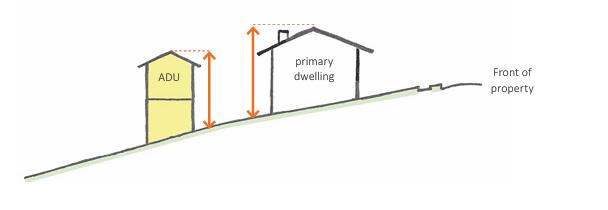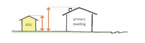 • An ADU can be seen from the street if it does not compete with the house. The ADU can have a different roof form from the primary structure. The ADU should not mimic the primary structure (Design Guidelines for Historic Districts in the City of Pasadena , California, p. 89).