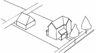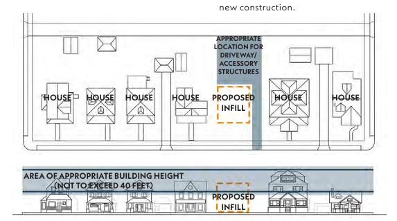 Locate accessory buildings such as sheds and garages at the rear of the lot, as is traditional. Adding them between existing buildings changes the spacing pattern along the street. (n.d.). Graphic, City of Golden.