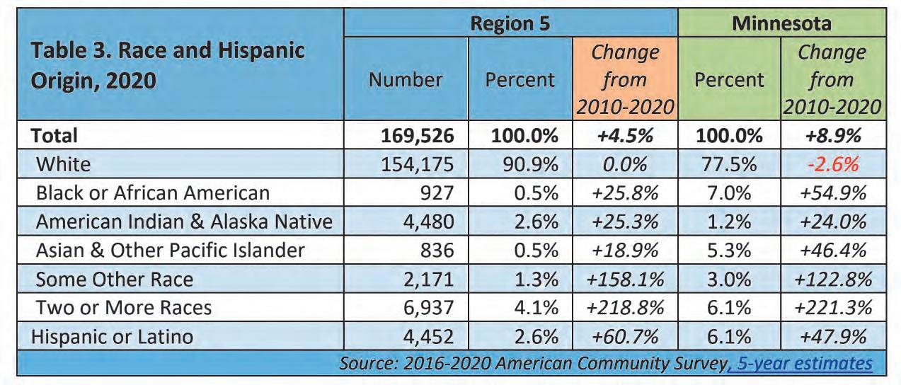 The population of Region 5 is projected to hold steady over the next decade. Population projections from the Minnesota State Demographic Center show an expected gain of just 337 residents from 2023 to 2033, a 0.2% increase. By comparison, the projected growth statewide from 2023 to 2033 is 5.6%. Then the region may start losing residents over the following decade.