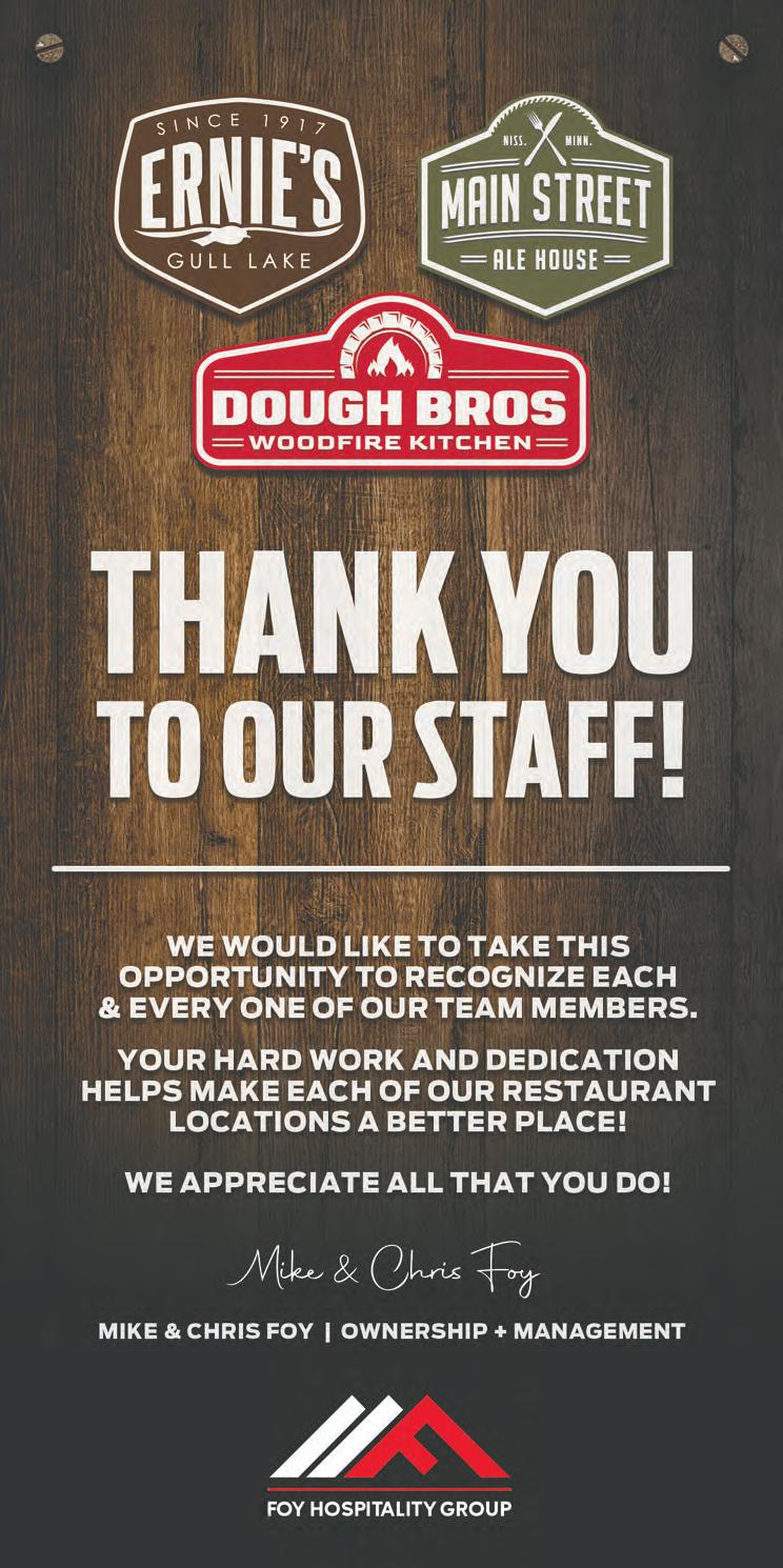 EAST BRAINERD 12110 MN-210 • Brainerd, MN NORTH LONG LAKE 19090 MN-371 • Brainerd, MN dunmiresbar.com Like us on Facebook and Instagram for upcoming events and specials North Long Lake 19090 MN-371 Brainerd, MN 56401 218-454-0690 East Brainerd 12110 MN-210 Brainerd, MN 56401 218-454-0625 Thank you for making us the Lakes Area #1 HOTSPOT