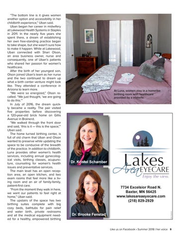 “The bottom line is it gives women another option and accessibility in her childbirth experience,” Uban said. Uban began her career in midwifery at Lakewood Health Systems in Staples in 2011. In the nearly five years she spent there, a dream of establishing her own free-standing practice began to take shape, but she wasn’t sure how to make it happen. While at Lakewood, Uban connected with Shari Olson, an area business owner, nurse and consequently, one of Uban’s patients who shared her passion for women’s healthcare. After the birth of her youngest son, Olson joined Uban’s team as her nurse and the two continued to dream up what a birth center venture might look like. They attended a conference in Arizona to learn more. “We were so energized,” Olson recalled. “We just thought, ‘we are going to do this.’” In July of 2016, the dream quickly became a reality. The pair visited five properties before discovering a 120-year-old brick home on Gillis Avenue in Brainerd. “We walked through the front door and said, ‘this is it — this is the space,’” Uban said. The home turned birthing center, is full of old charm that Uban and Olson wanted to preserve while updating the space to be conducive of the breadth of the practice. In addition to childbirth, Luna provides other women’s health services, including annual gynecological visits, birthing classes, acupuncture, counseling for women’s health issues and preventative services. The main level has an open reception area, an open kitchen, and two exam rooms that feel more like a living room and an air of family-family, patient-first care. “From the moment they walk in here, we want our patients to feel right at home,” Uban said. The upstairs of the space has two birthing suites complete with big cozy beds, bathtubs for pain relief and water birth, private restrooms and all the medical equipment needed for a healthy, empowered birthing