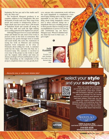 beginning. He has one end of the studio and I have the other end.” The beadwork Margaret produces is an exquisite addition to her lampshades. She uses thousands of beads each year. They range from pearls and crystals to semiprecious stones. A single shade may have more than 1,200 strands of individual beads and crystals all strung by hand. They shift and catch the light making never ending patterns in the slightest air current. Although Margaret loves to create individual lamps and shades for sale, most of her work at present comes in the form of restoration. Her reputation has grown through word of mouth and social media. She notes the excitement of seeing her work on Pinterest and receiving inquiries from companies as far away as Denmark about selling her work. A customer sends her the frame and often the base for a treasured lamp. The customer is involved in every step of the project as she works to replicate the original. After fabrics and trims are chosen, mockups of bead combinations are provided. Depending on the complexities of the project, completion times can vary greatly, how-