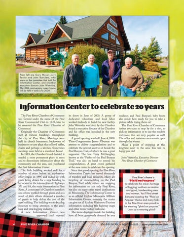Information Center to celebrate 20 years The Pine River Chamber of Commerce was formed under the name of the Pine River Commercial Club in 1949, later to be renamed the Pine River Chamber of Commerce! Originally the Chamber of Commerce met at various buildings throughout the city of Pine River. Meetings were held in church basements, backrooms of businesses or any place that offered tables, chairs and perhaps a kitchen. Sometimes meetings were held at a member’s house! In 1983, the Chamber board decided it needed a more permanent place to meet and to disseminate information about the community and the area, and purchased the first Information Center. The little building worked well for a number of years before an exploratory effort began in 1995 and ended up with plans being drawn for a new building to be located at the intersection of Highways 371 and 84, the main intersection in Pine River. A committee of Chamber members and others worked through plans and as a result of their efforts obtained a number of grants to help defray the cost of the new building. The building was to be a log structure to bring attention to the area’s long and vital logging industry. A new Information Center was approved and opened 4