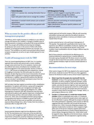 SMT principles have been applied successfully to other rehabilitation populations. For patients with limb loss, a group self-management treatment resulted in better pain management and higher selfconfidence compared to a support group (Wegener et al., 2009). SPIRITUAL Heterogeneous treatments with SMT components have also been administered to patients with cognitive impairment, including those 2. Consider a 1:1 format and/ or a model that includes family with stroke (Jones and Riazi, 2011) and multiple sclerosis (Raemembers. While it is potentially more costly, a 1:1 treatment Grant et al., 2011). One uncontrolled trial tested a group program SOCIAL format could be considered for people whose needs might not incorporating some features of CDSMP for persons with stroke be met effectively in a group. Although the prospect of learning and TBI; the severity of injury was not specified, and results were from other participants is appealing, some research on SMT has equivocal (Muenchberger et al., 2011). To date, there has not been a suggested that peer interaction may actually be detrimental systematic effort to adapt SMT to TBI. (Jonkman et al., 2016). Conversely, designing a program that explicitly includes family members (or other caregivers) might What are the challenges? offset some of the barriers related to cognitive dysfunction. There is a growing literature on family-centered approaches to Several potential obstacles might limit the effectiveness of SMT chronic disease management (Deek et al., 2016), which could for TBI. The most obvious one is that some of the very skills that be tapped for ideas. Regardless of the format chosen, materials are critical to self-management might be affected by the cognitive should be adapted for TBI and subjected to cognitive testing impairments so frequently caused by moderate to severe injury. TBI before use. may cause limitations in self-awareness, affecting the ability to set