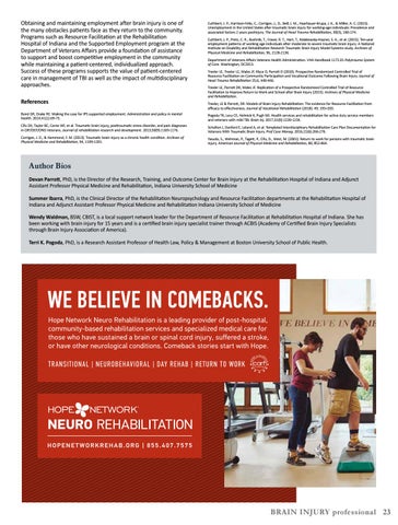 Author Bios Devan Parrott, PhD, is the Director of the Research, Training, and Outcome Center for Brain Injury at the Rehabilitation Hospital of Indiana and Adjunct Assistant Professor Physical Medicine and Rehabilitation, Indiana University School of Medicine Summer Ibarra, PhD, is the Clinical Director of the Rehabilitation Neuropsychology and Resource Facilitation departments at the Rehabilitation Hospital of Indiana and Adjunct Assistant Professor Physical Medicine and Rehabilitation Indiana University School of Medicine Wendy Waldman, BSW, CBIST, is a local support network leader for the Department of Resource Facilitation at Rehabilitation Hospital of Indiana. She has been working with brain injury for 15 years and is a certified brain injury specialist trainer through ACBIS (Academy of Certified Brain Injury Specialists through Brain Injury Association of America). Terri K. Pogoda, PhD, is a Research Assistant Professor of Health Law, Policy & Management at Boston University School of Public Health.