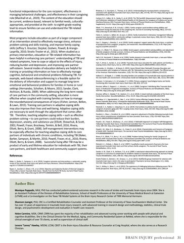 Bhalerao, S. U., Geurtjens, C., Thomas, et al. (2013). Understanding the neuropsychiatric consequences associated with significant traumatic brain injury. Brain Injury: [BI], 27(7–8), 767–774. https://doi.org/10.310 9/02699052.2013.793396 Carlozzi, N. E., Kallen, M. A., Hanks, R., et al. (2019). The TBI-CareQOL Measurement System: Development and Preliminary Validation of Health-Related Quality of Life Measures for Caregivers of Civilians and Service Members/Veterans With Traumatic Brain Injury. Archives of Physical Medicine and Rehabilitation, 100(4, Supplement), S1–S12. https://doi.org/10.1016/j.apmr.2018.08.175 Elliott, T. R., Shewchuk, R. M., & Scott, J. (2001). Family caregiver social problem-solving abilities and adjustment during the inital year of the caregiving role. Journal of Counseling Psychology, 48(2), 223–232. https://doi.org/10.1037/0022-0167.48.2.223 Fisher, A., Lennon, S., Bellon, M., & Lawn, S. (2015). Family involvement in behaviour management following acquired brain injury (ABI) in community settings: A systematic review. Brain Injury, 29(6), 661–675. https:// doi.org/10.3109/02699052.2015.1004751 Gan, C., Gargaro, J., Brandys, C., et al. (2010). Family caregivers’ support needs after brain injury: a synthesis of perspectives from caregivers, programs, and researchers. NeuroRehabilitation, 27(1), 5–18. https://doi. org/10.3233/NRE-2010-0577 Grant, J. S., Elliott, T. R., Weaver, et al. (2006). Social support, social problem-solving abilities, and adjustment of family caregivers of stroke survivors. Archives of Physical Medicine and Rehabilitation, 87(3), 343–350. https://doi.org/10.1016/j.apmr.2005.09.019 Hall, K. M., Karzmark, P., Stevens, et al. (1994). Family stressors in traumatic brain injury: a two-year followup. Archives of Physical Medicine and Rehabilitation, 75(8), 876–884. Hart, T., Driver, S., Sander, A., et al. (2018). Traumatic brain injury education for adult patients and families: a scoping review. Brain Injury, 32(11), 1295–1306. https://doi.org/10.1080/02699052.2018.1493226 Hernandez, H., Scholten, J., & Moore, E. (2015). Home Clinical Video Telehealth Promotes Education and Communication with Caregivers of Veterans with TBI. Telemedicine Journal and E-Health: The Official Journal of the American Telemedicine Association, 21(9), 761–766. https://doi.org/10.1089/tmj.2014.0155 Holland, D., & Shigaki, C. L. (1998). Educating families and caretakers of traumatically brain injured patients in the new health care environment: a three phase model and bibliography. Brain Injury: [BI], 12(12), 993–1009. Kreutzer, J S, Gervasio, A. H., & Camplair, P. S. (1994). Primary caregivers’ psychological status and family functioning after traumatic brain injury. Brain Injury: [BI], 8(3), 197–210. Kreutzer, Jeffrey S., Rapport, L. J., Marwitz, J. H., et al. (2009). Caregivers’ Well-Being After Traumatic Brain Injury: A Multicenter Prospective Investigation. Archives of Physical Medicine and Rehabilitation, 90(6), 939–946. https://doi.org/10.1016/j.apmr.2009.01.010 Kreutzer, Jeffrey S., Stejskal, T. M., Godwin, E. E., et al. (2010). A mixed methods evaluation of the Brain Injury Family Intervention. NeuroRehabilitation, 27(1), 19–29. https://doi.org/10.3233/NRE-2010-0578 Manskow, U. S., Sigurdardottir, S., Røe, C., et al. (2015). Factors Affecting Caregiver Burden 1 Year After Severe Traumatic Brain Injury: A Prospective Nationwide Multicenter Study. The Journal of Head Trauma Rehabilitation, 30(6), 411–423. https://doi.org/10.1097/HTR.0000000000000085 Marshall, C. A., Nalder, E., Colquhoun, H., et al. (2019). Interventions to address burden among family caregivers of persons aging with TBI: A scoping review. Brain Injury, 33(3), 255–265. https://doi.org/10.1080 /02699052.2018.1553308 Ponsford, J., Olver, J., Ponsford, M., et al. (2003). Long-term adjustment of families following traumatic brain injury where comprehensive rehabilitation has been provided. Brain Injury, 17(6), 453–468. https://doi. org/10.1080/0269905031000070143 Powell, J. M., Fraser, R., Brockway, J. A., et al. (2016). A Telehealth Approach to Caregiver Self-Management Following Traumatic Brain Injury: A Randomized Controlled Trial. The Journal of Head Trauma Rehabilitation, 31(3), 180–190. https://doi.org/10.1097/HTR.0000000000000167 Powell, J. M., Wise, E. K., Brockway, J. A., Fraser, R., et al. (2016). Characteristics and Concerns of Caregivers of Adults With Traumatic Brain Injury. The Journal of Head Trauma Rehabilitation. https://doi.org/10.1097/ HTR.0000000000000219 Rivera, P. A., Elliott, T. R., Berry, J. W., et al. (2008). Problem-Solving Training for Family Caregivers of Persons With Traumatic Brain Injuries: A Randomized Controlled Trial. Archives of Physical Medicine and Rehabilitation, 89(5), 931–941. https://doi.org/10.1016/j.apmr.2007.12.032 Rotondi, A. J., Sinkule, J., Balzer, K., et al. (2007). A qualitative needs assessment of persons who have experienced traumatic brain injury and their primary family caregivers. The Journal of Head Trauma Rehabilitation, 22(1), 14–25. Sander, A. M., Clark, A. N., Atchison, T. B., et al. (2009). A web-based videoconferencing approach to training caregivers in rural areas to compensate for problems related to traumatic brain injury. The Journal of Head Trauma Rehabilitation, 24(4), 248–261. https://doi.org/10.1097/HTR.0b013e3181ad593a Straits-Troster, K., Gierisch, J. M., Strauss, J. L., et al. (2013). Multifamily group treatment for veterans with traumatic brain injury: what is the value to participants? Psychiatric Services (Washington, D.C.), 64(6), 541–546. https://doi.org/10.1176/appi.ps.001632012 Tam, S., McKay, A., Sloan, S., et al. (2015). The experience of challenging behaviours following severe TBI: A family perspective. Brain Injury, 29(7–8), 813–821. https://doi.org/10.3109/02699052.2015.1005134