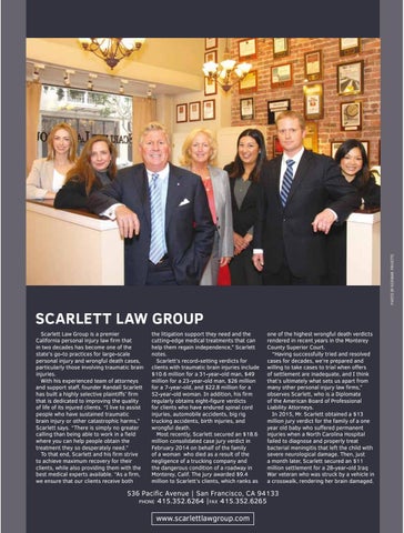 SCARLETT LAW GROUP Scarlett Law Group is a premier California personal injury law firm that in two decades has become one of the state’s go-to practices for large-scale personal injury and wrongful death cases, particularly those involving traumatic brain injuries. With his experienced team of attorneys and support staff, founder Randall Scarlett has built a highly selective plaintiffs’ firm that is dedicated to improving the quality of life of its injured clients. “I live to assist people who have sustained traumatic brain injury or other catastrophic harms,” Scarlett says. “There is simply no greater calling than being able to work in a field where you can help people obtain the treatment they so desperately need.” To that end, Scarlett and his firm strive to achieve maximum recovery for their clients, while also providing them with the best medical experts available. “As a firm, we ensure that our clients receive both