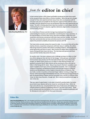 Drs. Kristin Dams-O’Connor and John Corrigan have dedicated their careers to understanding the messiness and complexities in predicting brain injury outcomes. In this Special Edition on Chronic Brain Injury, they have assembled a stellar line up of researchers and clinicians and persons with brain injury and their families. As a result, they have summarized what we know and what we yet do not understand as they explore the persistent variability of outcomes for persons with TBI. Their lead article concisely reviews the research to date. It is an article that will be often cited by clinicians, researchers and persons with brain injury. In addition, this edition helps bring research to practice with articles on building resilience, self-management, sexual dysfunction and return to work. Most of what this edition does is bring the real issues of living with brain injury into focus. The interviews with persons with brain injury and their families help anchor the issues. On another note, It has been a pleasure and a challenge serving as Co-Editor-in-Chief since 2014, taking over that role from Dr. Ron Savage. In this past year as the North American Brain Injury Society and The International Brain Injury Associations have merged, Dr. Nathan Zasler joined me as Co-Editor-in-Chief. Moving forward, I am pleased to announce that Dr. Beth Slomine will be assuming my role as the new CoEditor in Chief along with Dr. Zasler. Many of you know Dr. Slomine’s reputation as an expert in pediatric brain injury and an accomplished researcher. She is an Associate Professor of Psychiatry and Behavioral Sciences and Associate Professor of Physical Medicine and Rehabilitation at Johns Hopkins University School of Medicine. She also holds a number of positions at Kennedy Krieger Institute including serving as the Director of Neuropsychological Rehabilitation Services, The Neuropsychology Director of both the Responsiveness Program and the Concussion Clinic, and the Co-Director of the Center for Brain Injury Recovery. Enough said. She is clearly accomplished and eager to take on the role. They say a sign of a good leader is to be able to hand off a position better than when you arrived so your absence will not be missed (or something like that). While I do hope some will miss me, I am proud of the Brain Injury Professional, and I believe it is uniquely poised to continue its expanding influence in the brain injury world. Thank you to everyone who has contributed to the success of this exceptional publication and for allowing me to be a part of it for these past many years.