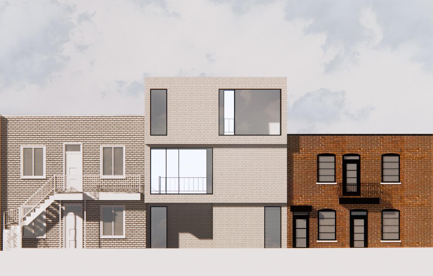 Situé dans le quartier de Rosemont, la Petite Patrie, le duplex loge une personne aînée au premier étage et une famille aux étages supérieurs. La forme prédominante des maisons sont des prismes pleins, le tout ayant une allure statique. La maison Glissement structurée reprend cette forme de base et tente de l’animer. La modification est la suivante : chaque niveau correspond à un glissement horizontal. Grâce aux glissements horizontaux, de nouveaux espaces se créent et permettent une meilleure cohésion entre rue, maison et ruelle.