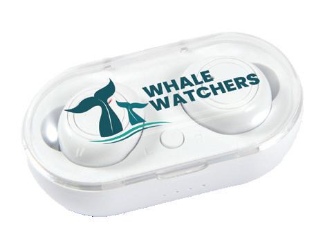 Mini in-ear earbuds with flip-top charging case. High-definition stereo sound, built-in mic, 3 hours listening time. Includes micro USB cable. Available in White or Black.