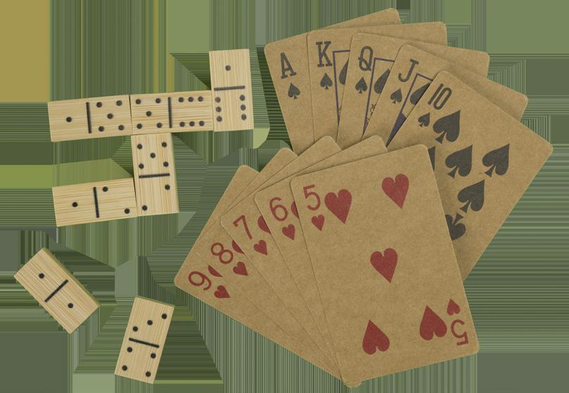This set includes a deck of kraft playing cards and bamboo dominoes, all housed in a handy bamboo box with a slide-open lid.