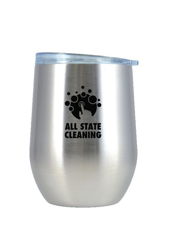 Double-walled, stainless steel vacuum cup with screw lid and push-button feature allowing for drinking from any position on the rim.