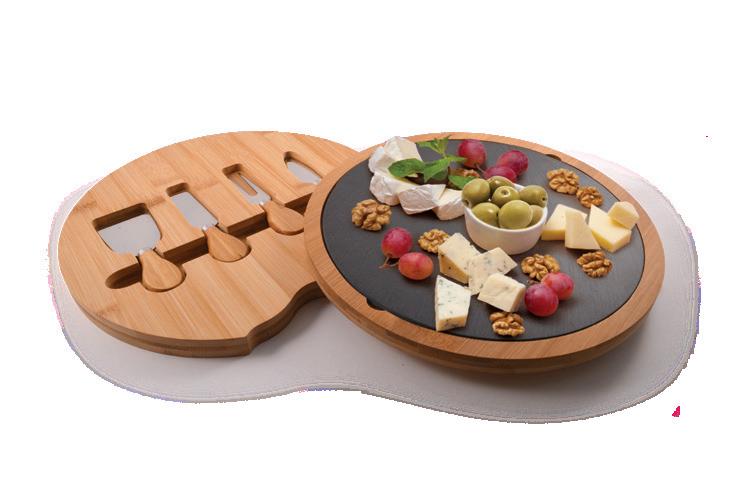 Cheese board set featuring bamboo board with slide-opening lid, removable slate insert, and four bamboo/stainless steel knives.