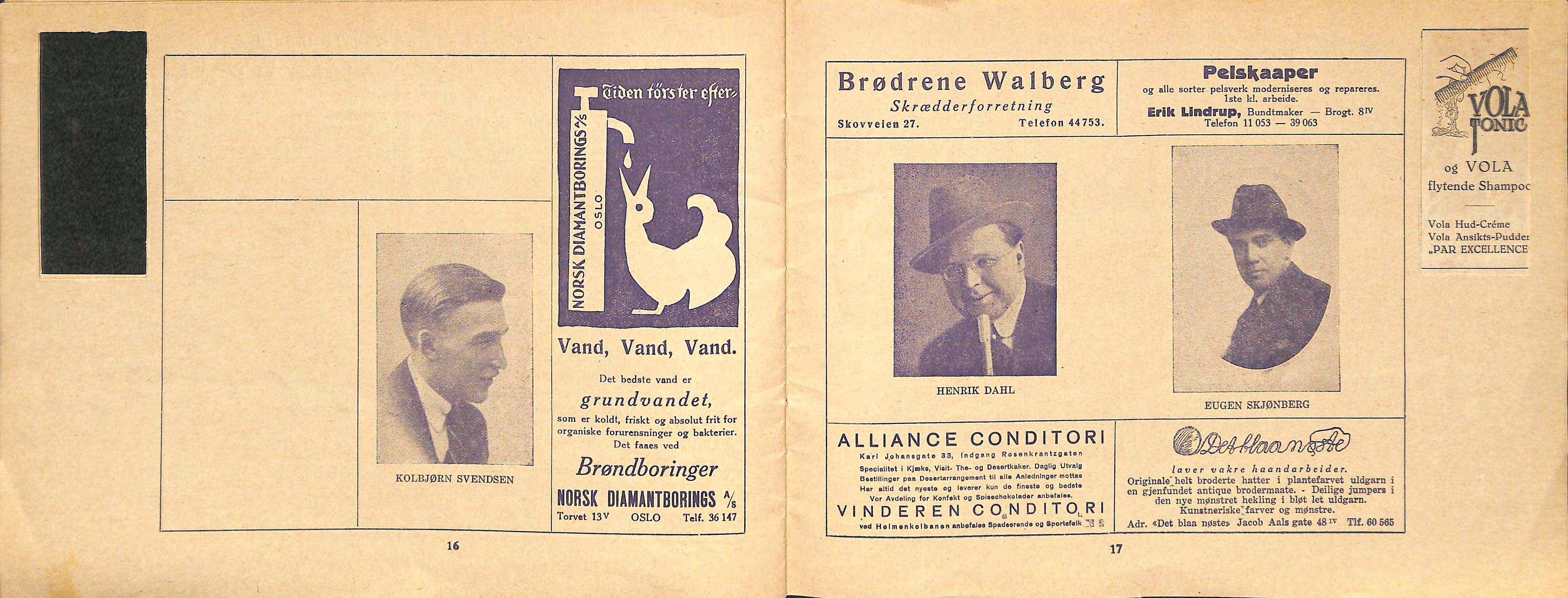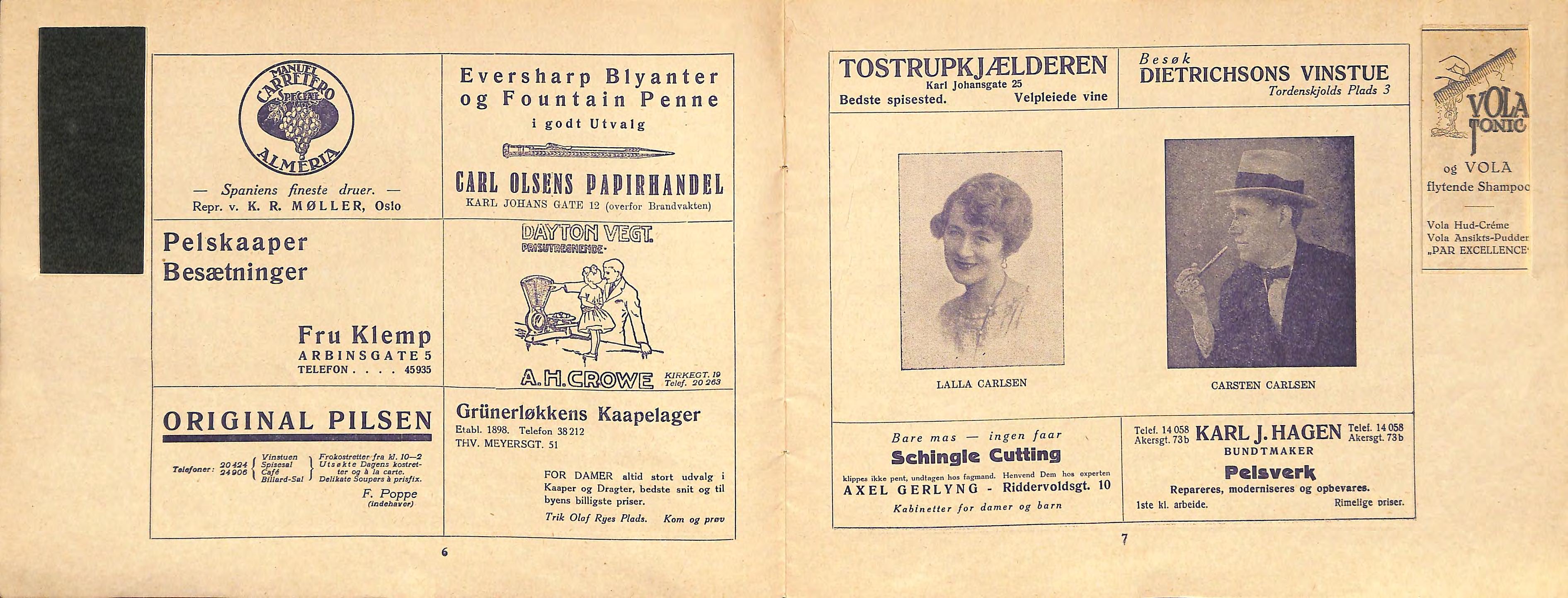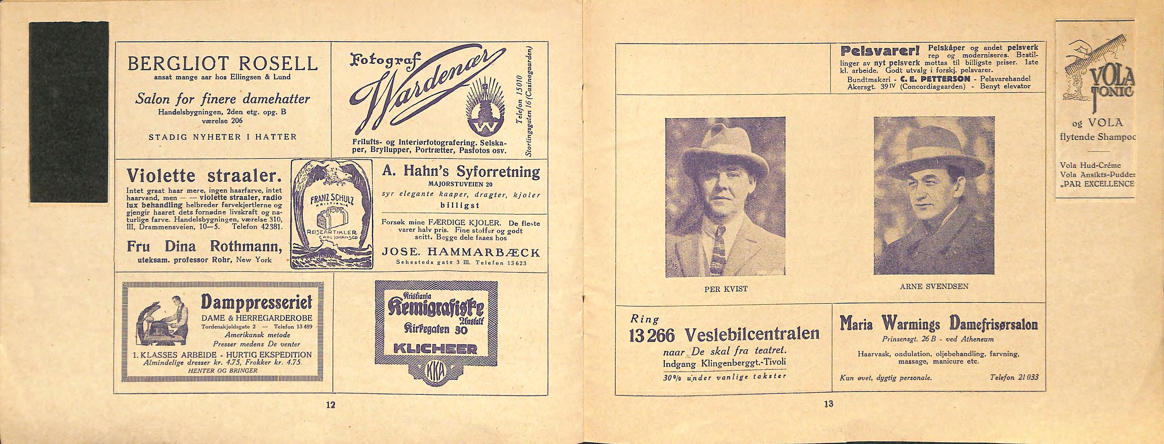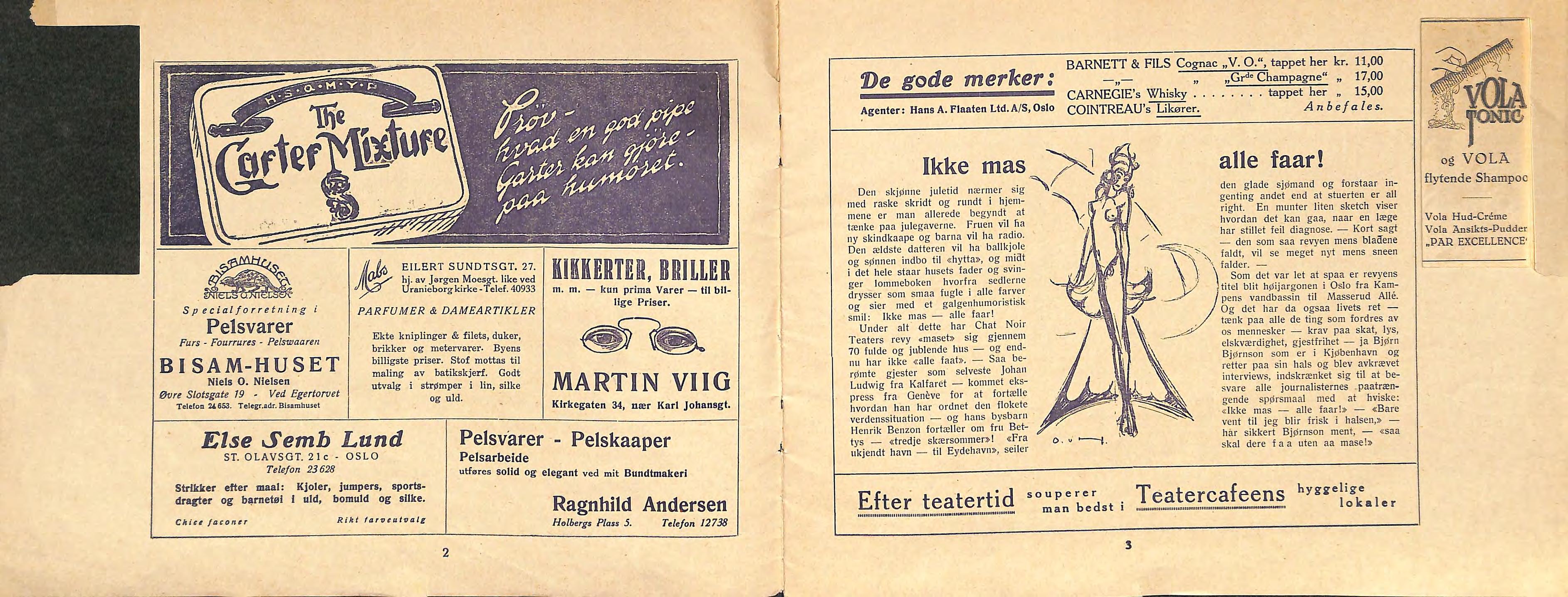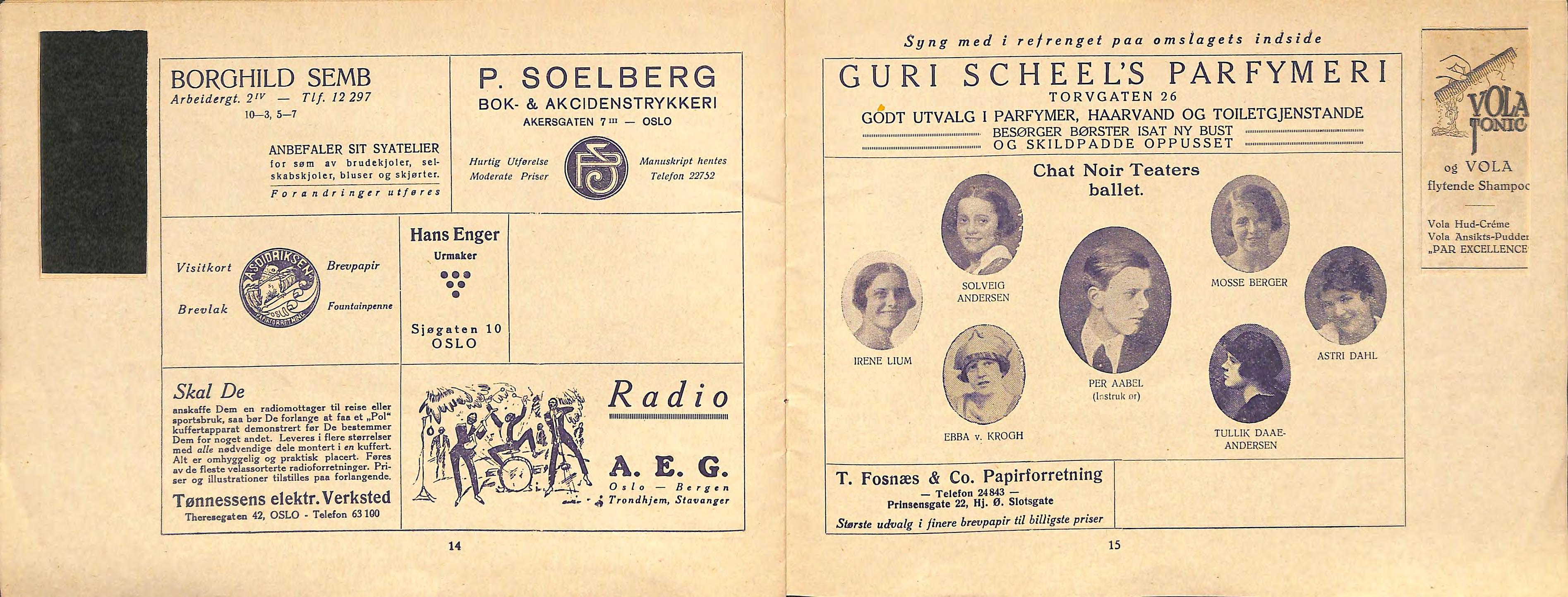 F-inds ide Syng med irefrenget paa omslagets GURI SCHEEL’5 PARFYMERI P. SOELBERG BORGHILD SEMB TORVGATEN 26 GODT UTVALG IPARFYMER, HAARVAND OG TOILETGJENSTANDE BESØRGER BØRSTER ISAT NY BUST OG SKILDPADDE OPPUSSET Arbeidergt. 2^^ —Tlf. 12 297 10—3, 5-7 BOK- &AKCIDENSTRYKKERI AKERSGATEN T”* —OSLO immMMtMiitiimtmmi iiiMiimmiiiiiiiiiiMunmiiiMmimimimiuiinim* inimimnnmimiMiiiiinMmimMMMMiiiMiiiiMMM ANBEFALER SIT SYATELIER Manuskript hentes Telefon 22752 Hurtig Utførelse Moderate Priser sel- brudekjoler, for søm skabskjolcr, bluser og skjørter. og VOLA flytende Shampoc av Chat Noir Teaters ballet. Forandringer utføres Vola Hud-Créme Vola Ansikts-Puddei „PAR EXCELLENCE Hans Enger Urmaker Brevpapir Visitkort ●●● MOSSE BERGER SOLVEIG ANDERSEN Fountaxnpenne Brevlak Sjøgate n10 OSLO ASTRI DAHL IRENE LIUM PER AABEL (Instruk or) Radio