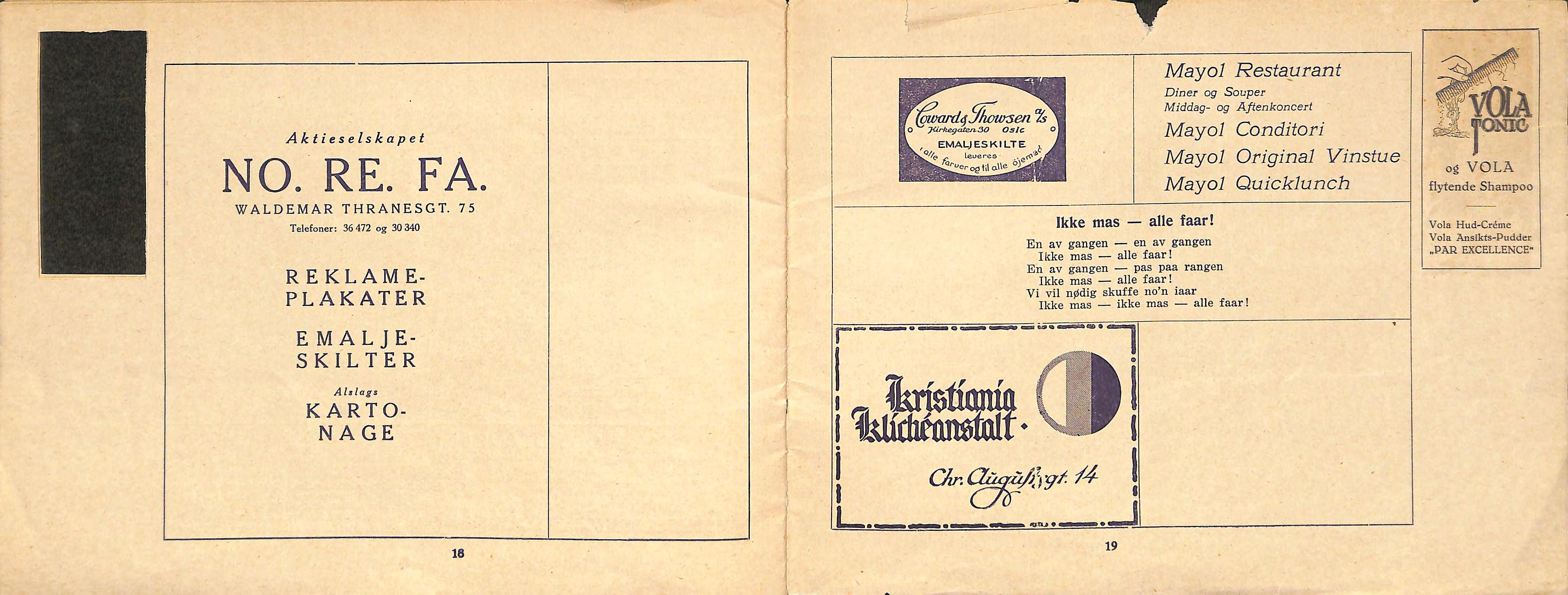 Restaurant Diner og Souper Middag- og Åftenkoncert Mayol Conditori Mayol Original Yinstue Mayol Quicklunch mM ‘r Aktieselskapet EMALJESKILTE leuercs NO. RE. FA. o)‘ Og VOLA flytende Shampoo og til atl® WALDEMAR THRANESGT. 75 Telefoner: 36 472 og 30 340