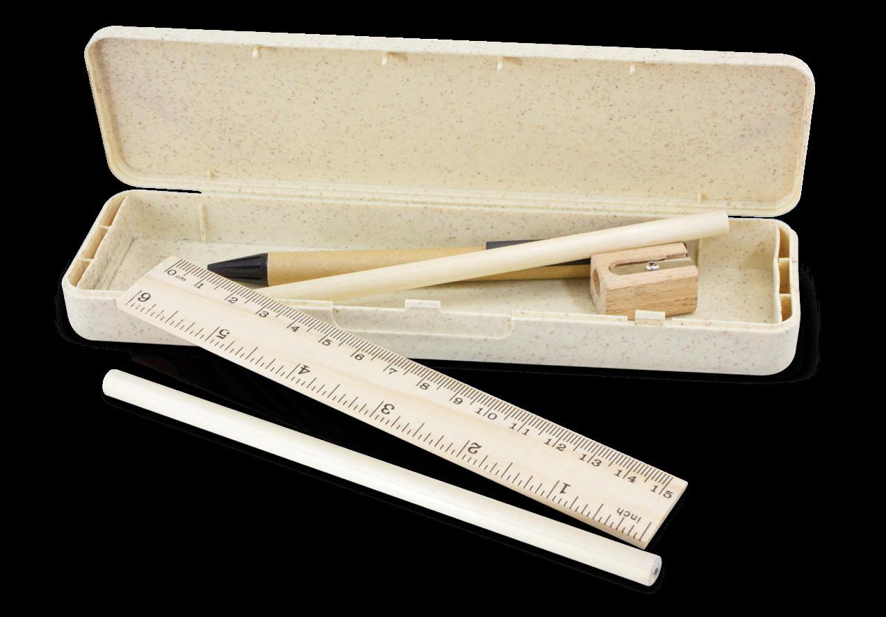 • Includes a 15cm wooden ruler with measurements in inches and centimetres, two wooden HB pencils, wooden pencil sharpener and retractable ballpoint pen with cardboard barrel