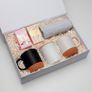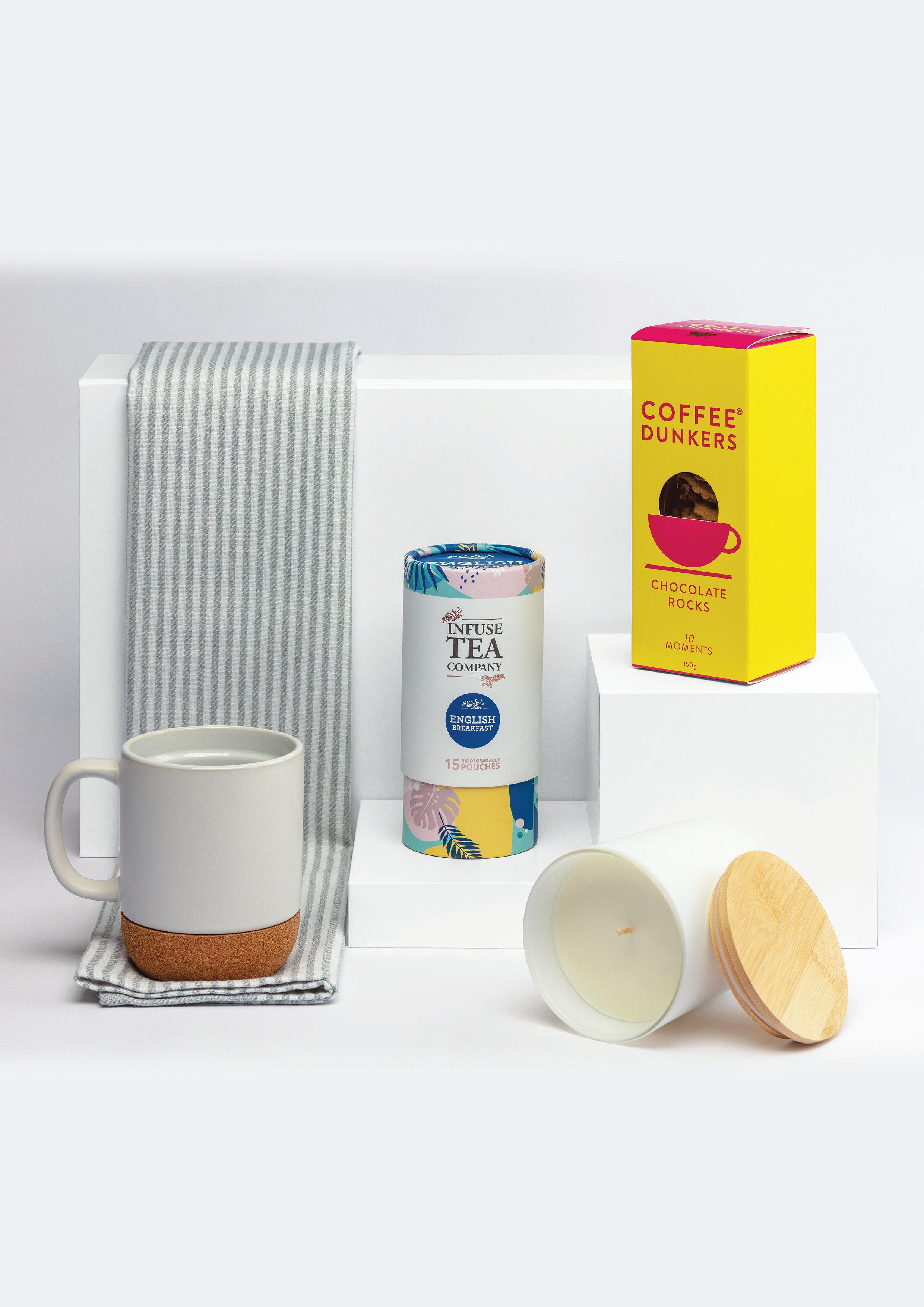 Lift open the magnetic-close box and you’ll find everything needed for a cosy coffee or tea ritual. A sleek ceramic coffee mug with an insulated cork base. A softly glowing vanilla-scented candle. Rich English Breakfast tea and crunchy coffee dunker cookies for the perfect pairing. Finished with a soft pinstripe cotton tea towel, The Brew Ritual is equal parts practical and indulgent – ideal for thoughtful gifting. Custom Branding Included
