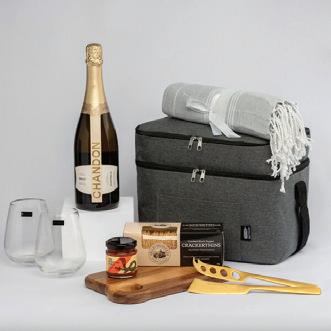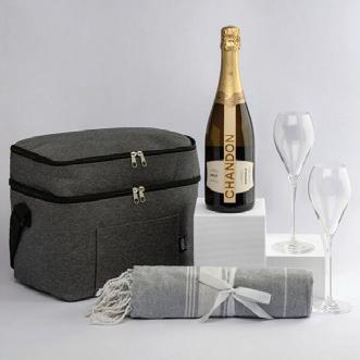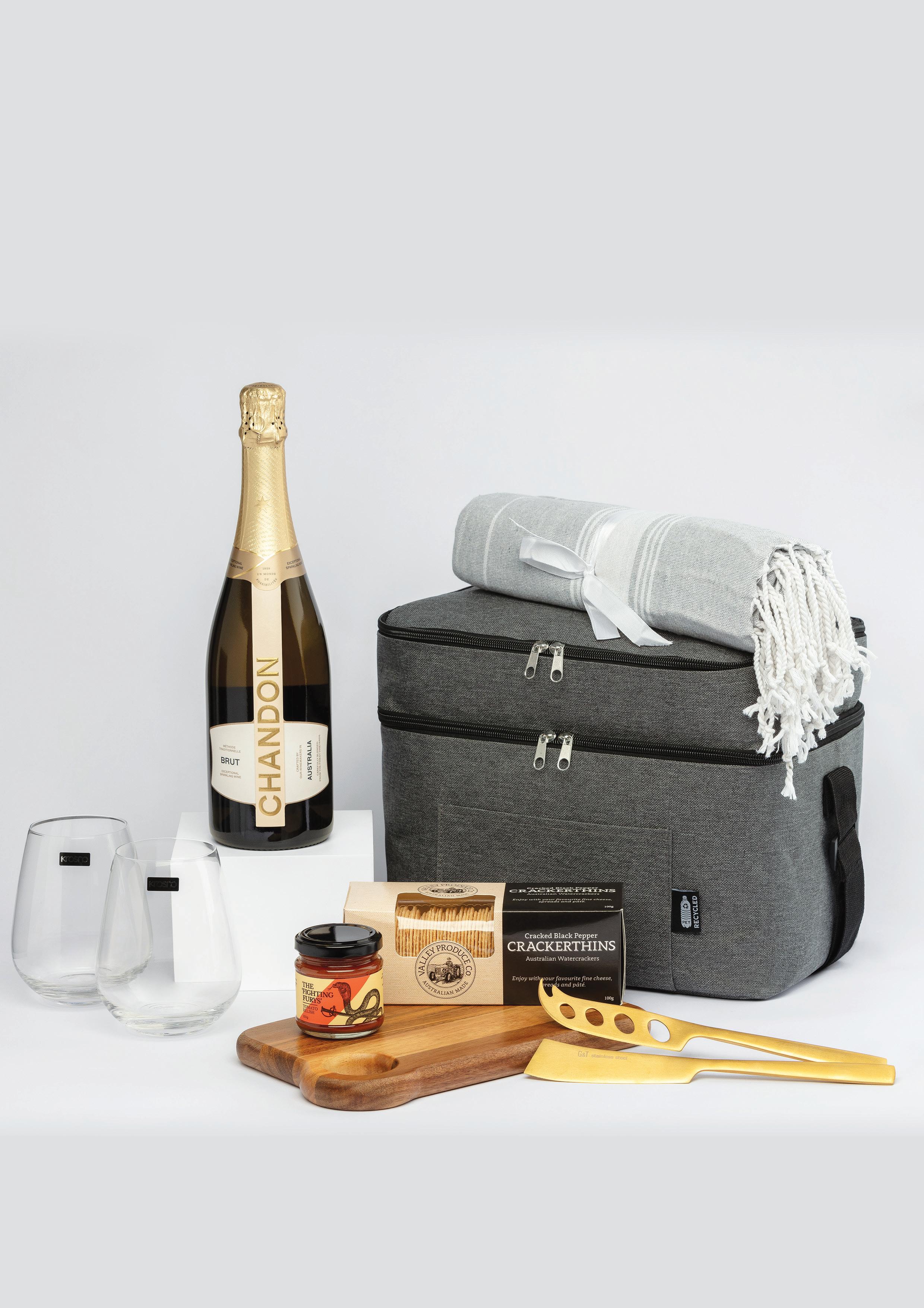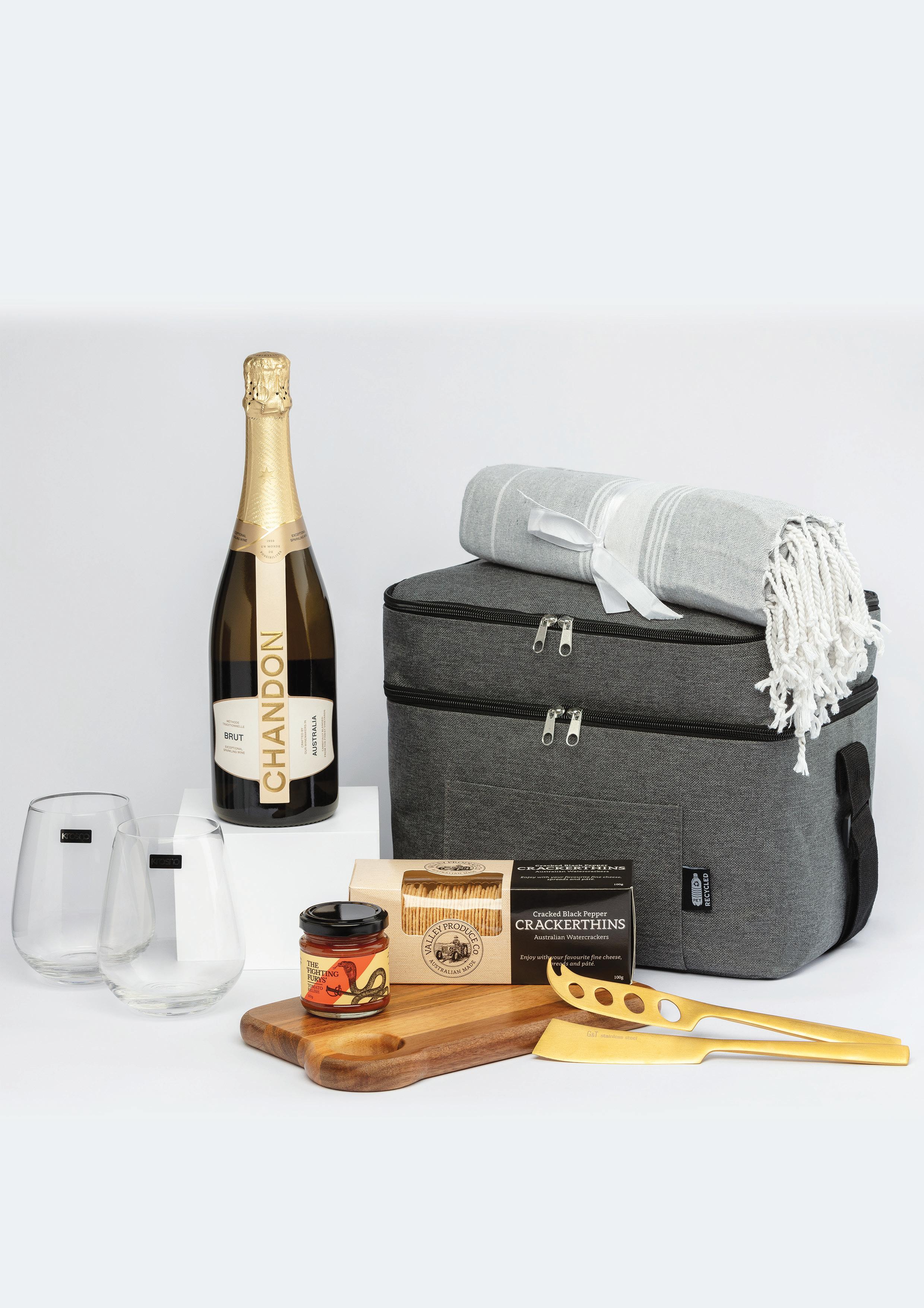 Unzip the sleek grey cooler bag and you’ve got everything for a shared toast and a little grazing on the side. A bottle of Chandon. Two elegant stemless glasses from the iconic Krosno glassware brand. A rich acacia serving board with gold cheese knives. Savoury crackers and a jar of tomato relish to match. Plus, a soft grey towel for those laid-back, sunny escapes.