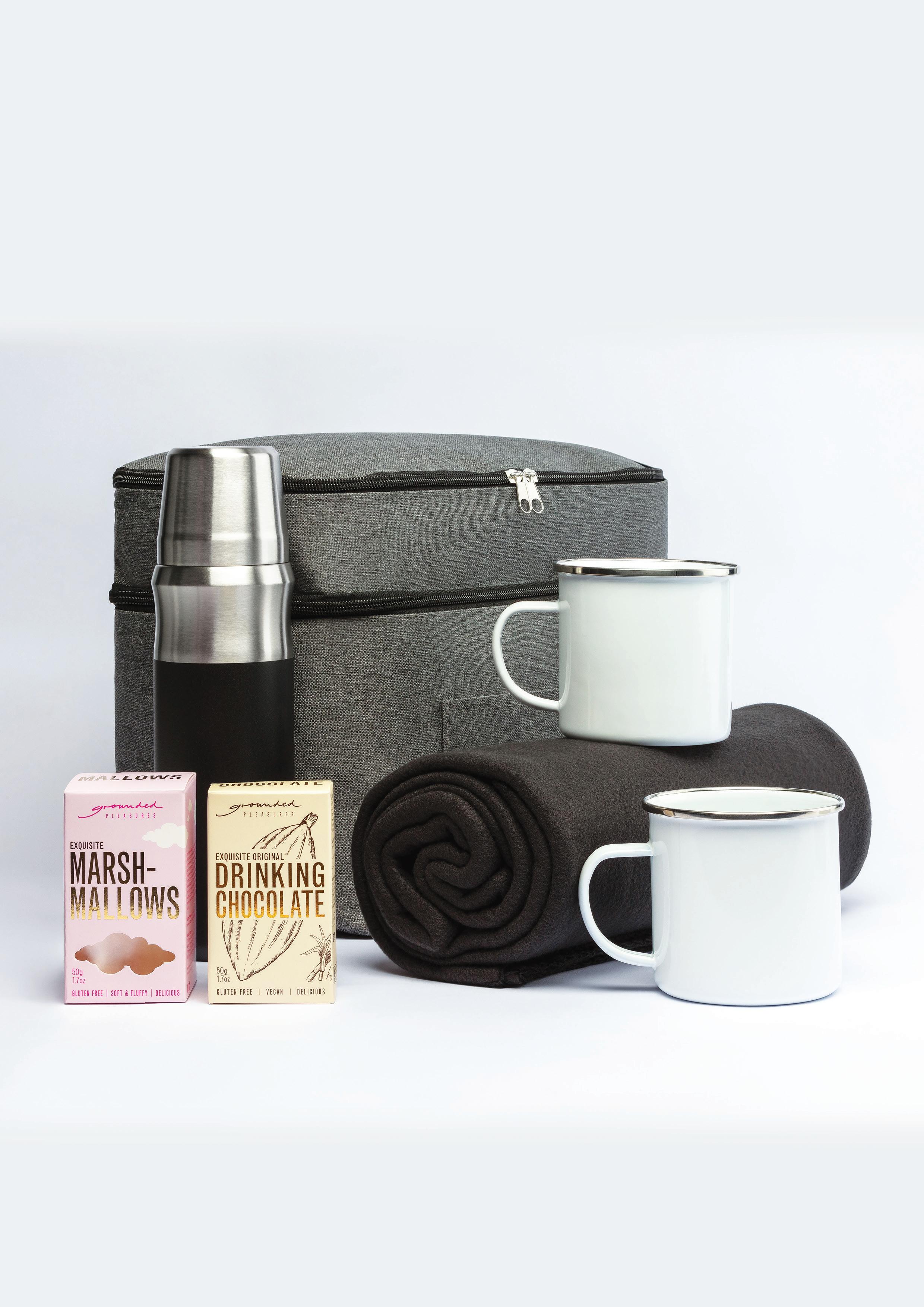 Unzip the grey cooler bag and discover a curated set designed for warmth and comfort. A sleek 600ml vacuum flask keeps your drinks at the perfect temperature on the go. Two enamel mugs are ready for sharing. A rich mini drinking chocolate and soft, all-natural marshmallows make every sip feel indulgent. And the eco-friendly polar fleece blanket wraps it all up in sustainable softness.