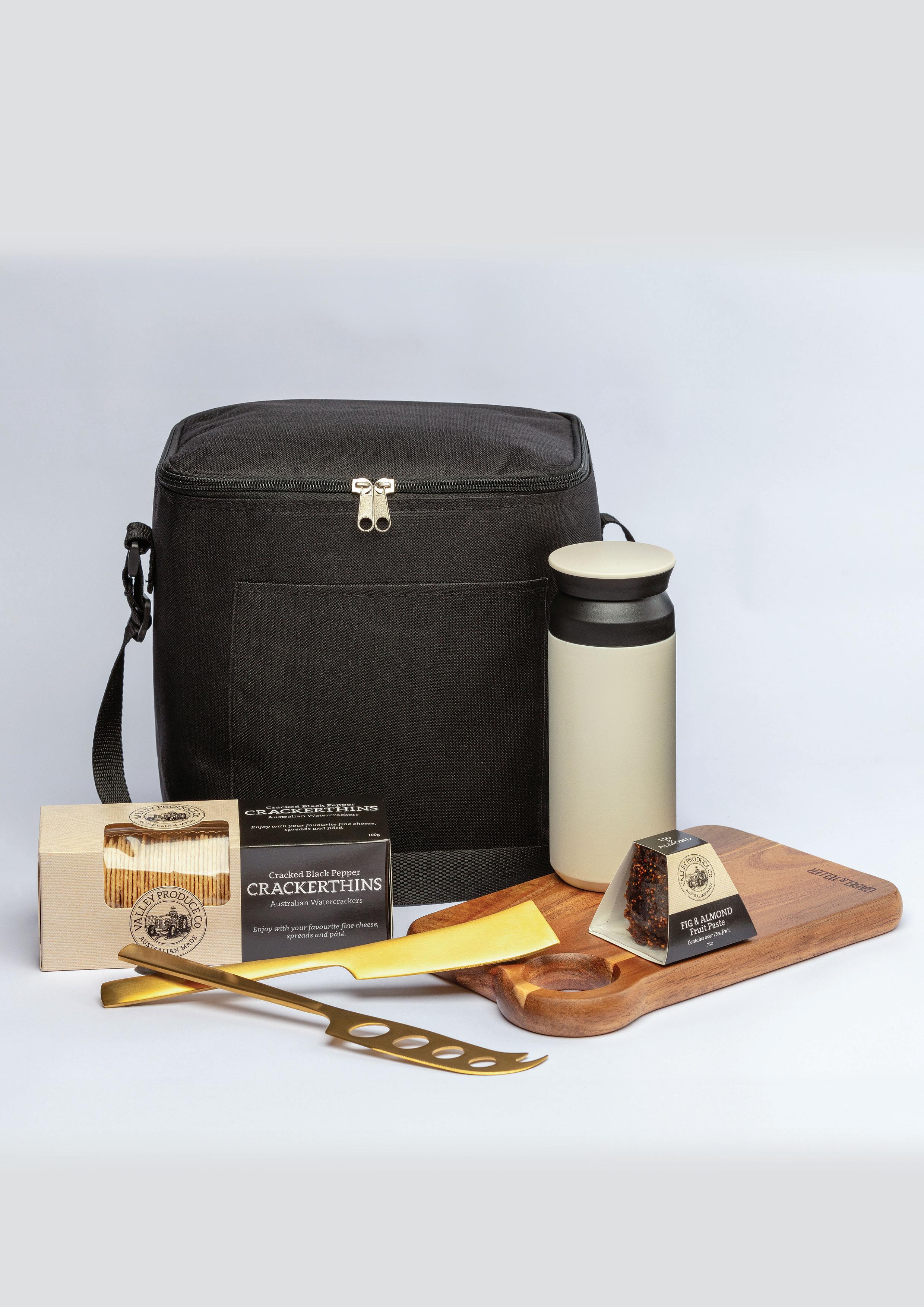 Unzip the insulated cooler bag and you’ll find everything needed for a sleek, savoury moment on the move. A smooth acacia serving board. Luxe gold cheese knives. Crackers and fig & almond fruit paste. And a double-wall insulated cup that keeps drinks hot or cold – tea, coffee, chilled spritz... you choose.
