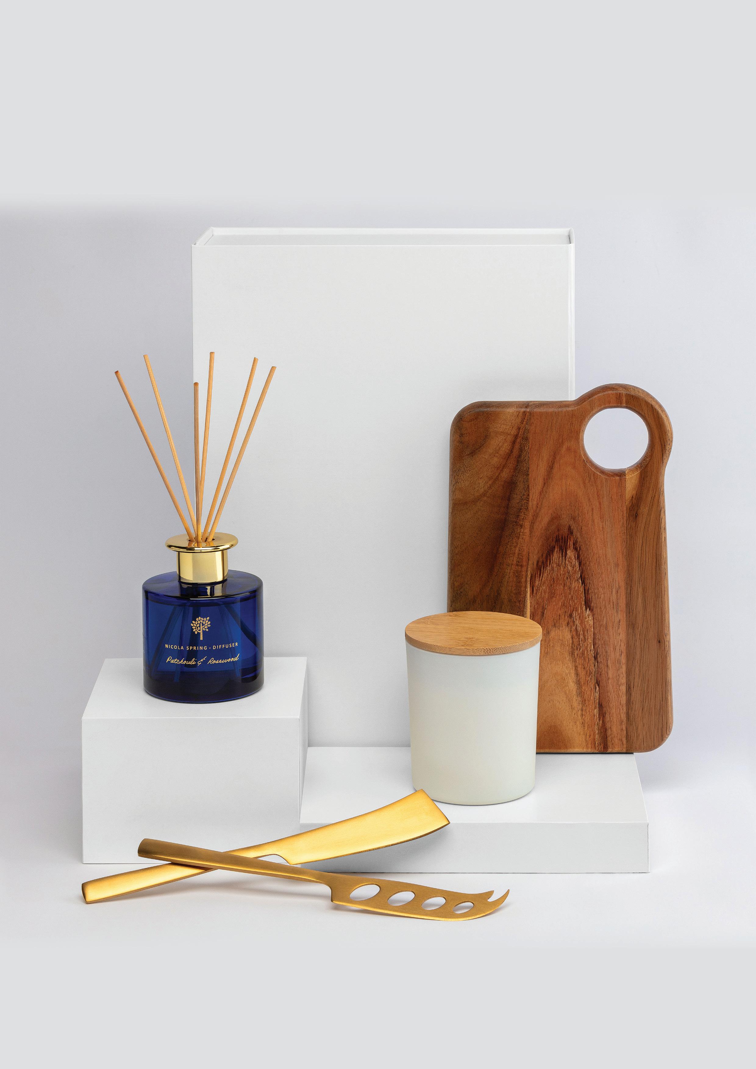 Lift open the lid and you’ll find the perfect balance of entertaining and ambience. A smooth acacia cheeseboard. Luxe gold cheese knives. A softly scented vanilla candle. And a glass reed diffuser that fills the room with warm patchouli and rosewood for up to 70 days. The Host Edit is all about pairing style with function – perfect for housewarmings, settlement gifts, or any moment that deserves a little glow.