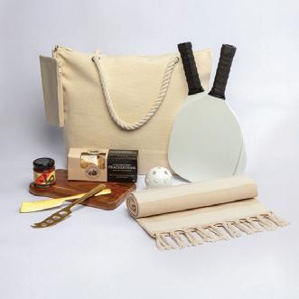 Inside the sturdy canvas tote, you’ll find a perfect mix of relaxed grazing essentials and a little bit of play. A smooth acacia serving board with satin gold cheese knives. Crisp crackers paired with a jar of rich tomato relish. A soft beige Turkish-style towel for laying out or drying off. And a complete pickleball set for an instant hit of fun in the sun.