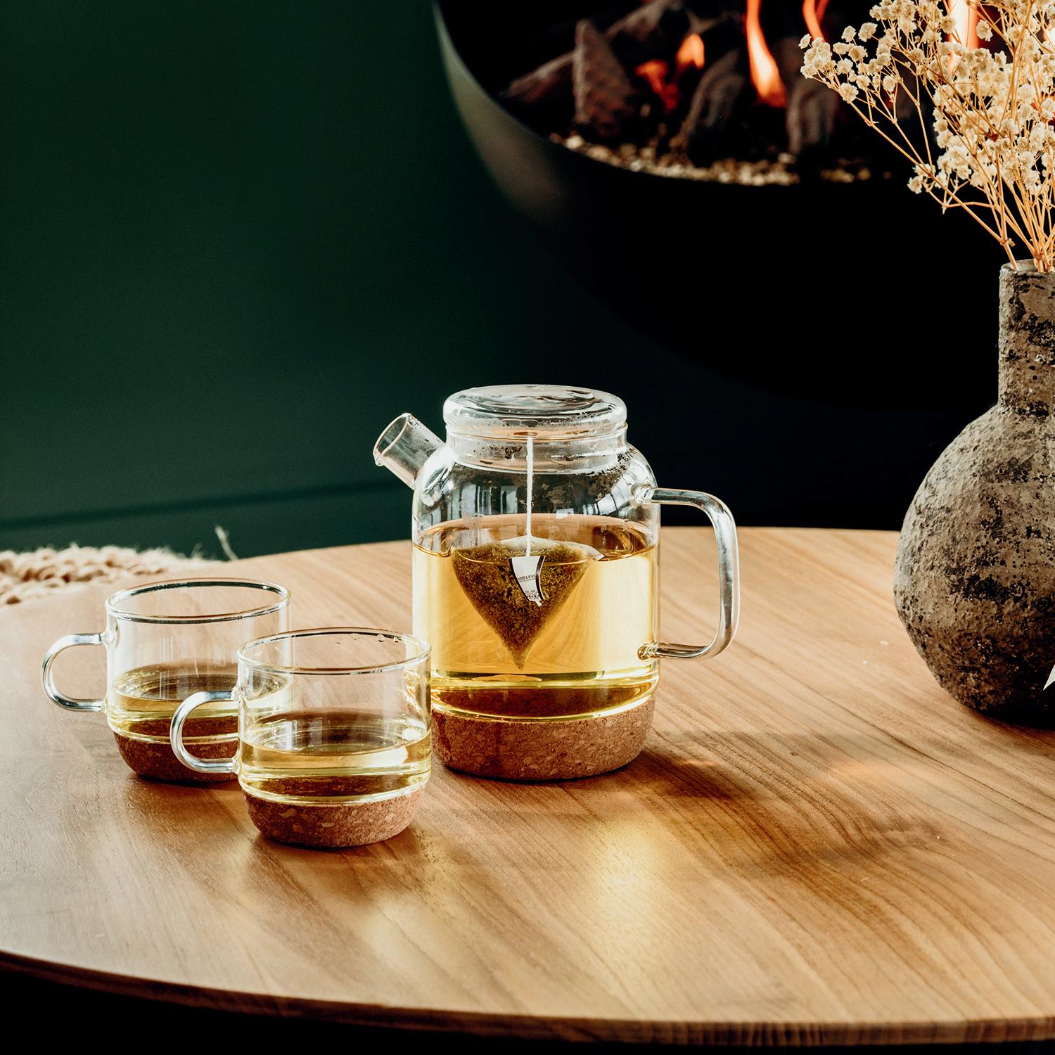Stylish tea set that comes with a 800ml tea pot and two 250ml glass mugs. Manufactured from double wall borosilicate glass with a natural cork base, making the set durable with heat insulation properties. The set is presented in a natural gift box with a branded black sleeve.. Hand Wash.