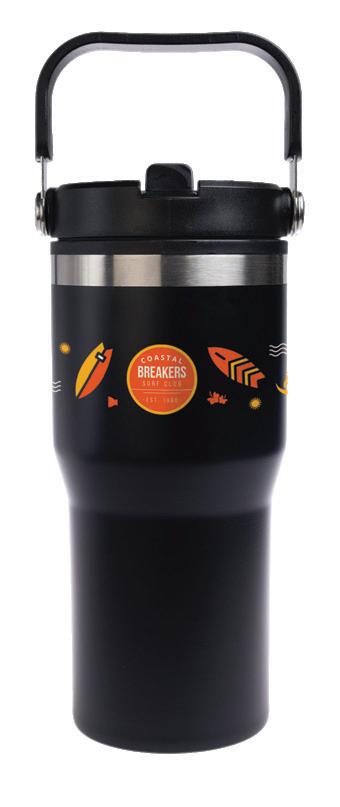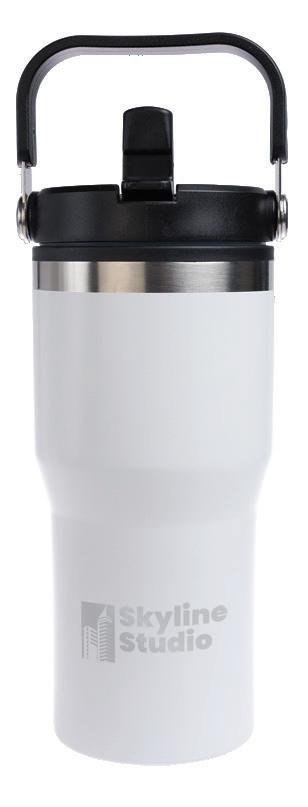 Double-wall tumbler with a stainless steel outer and PP Inner, black screw-in lid, flip-up mouthpiece, clear straw, and black grip handle. Available in matte black and white. Capacity: 620ml
