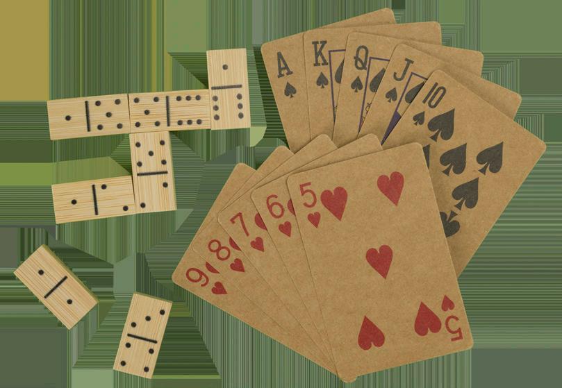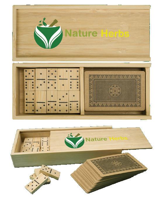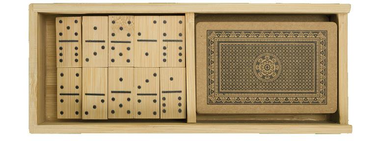 This set includes a deck of kraft playing cards and bamboo dominoes, all housed in a handy bamboo box with a slide-open lid.