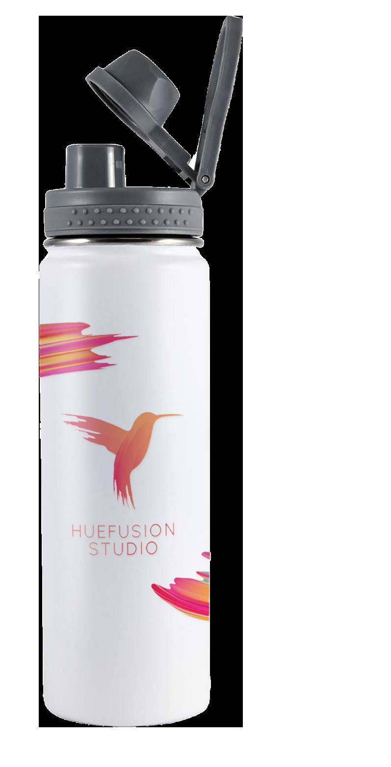 Double-wall stainless steel vacuum bottle with screwon sip lid, stainless steel straw, and silicone carry strap. Available in Matte Black or Gloss White. Capacity: 600ml.