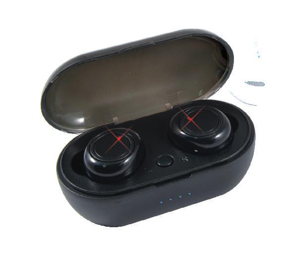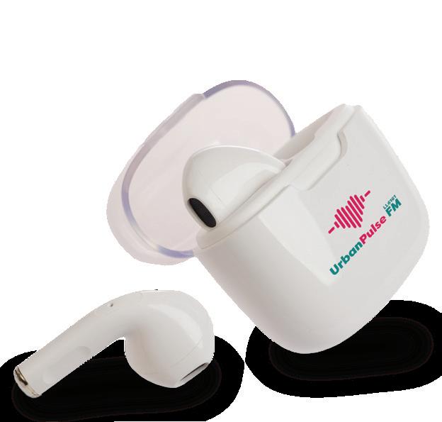 Mini in-ear earbuds with flip-top charging case. High-definition stereo sound, built-in mic, 3 hours listening time. Includes micro USB cable. Available in White or Black.